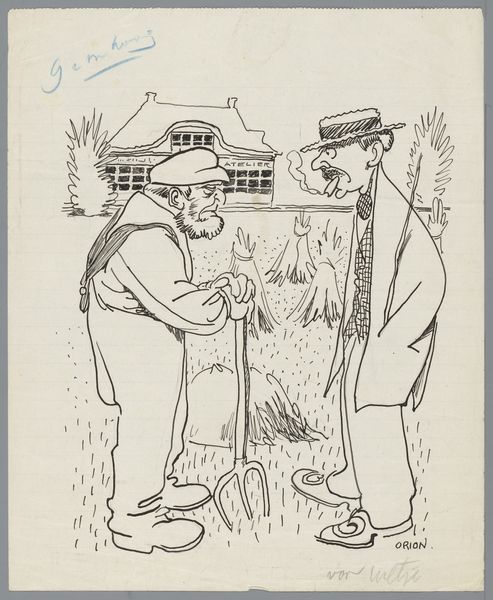 C. Goes created this ink drawing of a man and boy looking at an airplane. Although we do not have a date for this work, the clothing styles and presence of an early aircraft suggest it was made in the early 20th century. Consider the cultural context of that time, a period marked by rapid technological advancements and shifting social norms. Airplanes captured the imagination of the public and came to symbolize progress. In the drawing, the man, possibly a father or grandfather, is depicted with a walking stick, wearing traditional attire, while the boy points excitedly towards the sky. The artist captures the wonder and awe of witnessing flight through the eyes of the child, offering a glimpse into a shared moment of excitement between generations. But it also signifies something about the changes to masculinity in the 20th century. The image evokes feelings of nostalgia, curiosity, and a longing for exploration. It reflects the emotional impact of technological advancements on society and the sense of possibility that came with them.