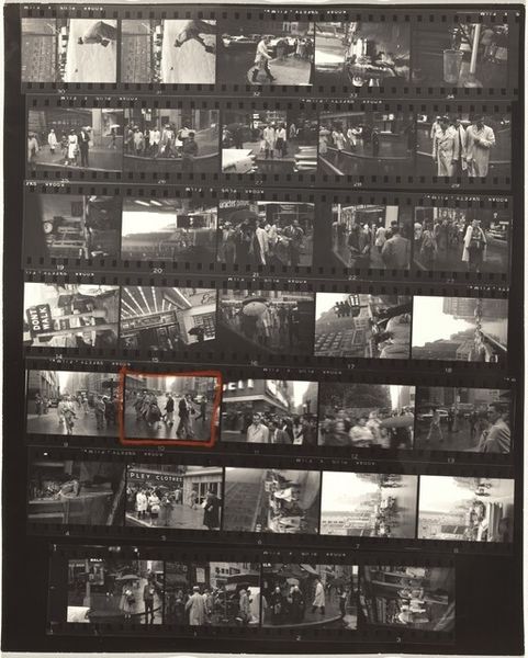 This is Robert Frank's contact sheet, Hearn's--New York City no number, with all those silver gelatin prints, like notes from another world. I’m always drawn to work that shows process, and here, the grid of images feels like a storyboard of Frank's mind as he moved through the city. Look at how he crops in on the people, then pulls back to show the broader scene. Each frame is a little experiment. I love this sense of searching for the right shot. In the upper left, there's a tightly framed shot of a woman with a dark jacket. The contrast is stark, almost bruised. Frank has this knack for capturing these off-kilter moments that feel both intimate and alienating. It reminds me of Garry Winogrand’s street photography—that same hunger to capture the fleeting moments of everyday life, only Frank is somehow sadder, more melancholic. He’s a master of the minor key. It reminds you that art’s an ongoing conversation. A way of seeing and feeling, passed down and transformed.
