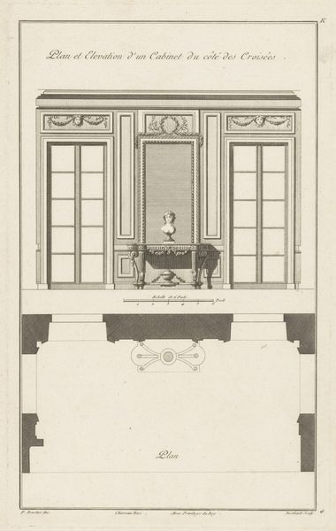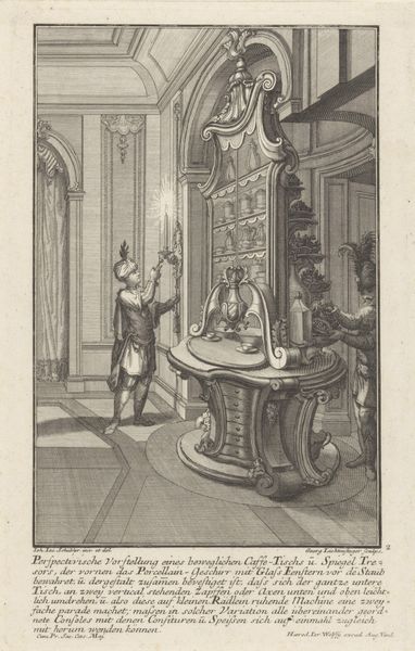 Curator: This print from the Rijksmuseum depicts a richly decorated chimneypiece. The title, "Geornamenteerde schouw met cartouche," translates to "Ornamented Mantelpiece with Cartouche." It's an engraving made anonymously sometime between 1726 and 1741. Editor: Immediately, what strikes me is its baroque flamboyance. It exudes power, privilege – a sort of architectural overcompensation! All those swirling forms crammed in there. Curator: Indeed, that Baroque exuberance served very specific socio-political functions. Think about the symbolic weight of the hearth: It was the focal point of the home, representing wealth, status, and patriarchal power. This mantelpiece visually reinforced those hierarchies within domestic spaces. Editor: But did these grandiose designs trickle down into more ordinary homes, creating aspirational desires and normalizing displays of dominance even among the middle class? I imagine the politics of interior design permeated society quite deeply. Curator: Absolutely. And let's consider the "cartouche" – that oval or scroll-like frame. These often contained coats of arms, family crests, or symbolic images, acting as very public statements of lineage and personal identity. Think about how these designs were used in domestic environments and were also exported to influence broader architectural styles during an era of intense cultural exchange. Editor: So, even something as seemingly functional as a fireplace was laden with ideological meaning. It raises questions about who had access to these spaces, whose stories were deemed important enough to immortalize in stone or, in this case, engraving, and whose labor enabled all this ostentation. This form, like the form of much historical architecture, implies the structural subjugation of particular demographics in 18th century society. Curator: Precisely. Even in a relatively "minor" artwork like this, we can excavate these complex histories of power and representation. It really challenges us to think critically about how taste and aesthetics can be intertwined with politics and class. Editor: It shifts our perspective, doesn’t it? Looking at art like this transforms seemingly simple decorative motifs into powerful statements about society’s foundational, and still persistent, inequalities.