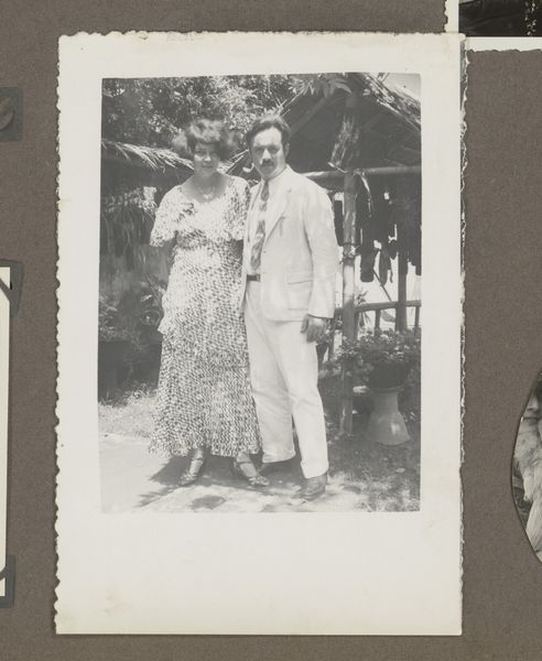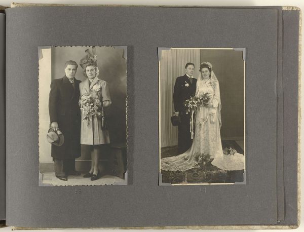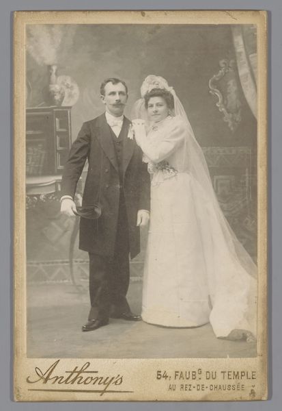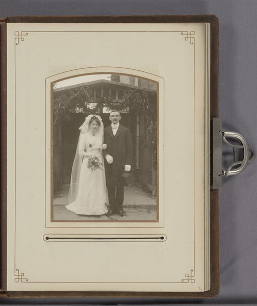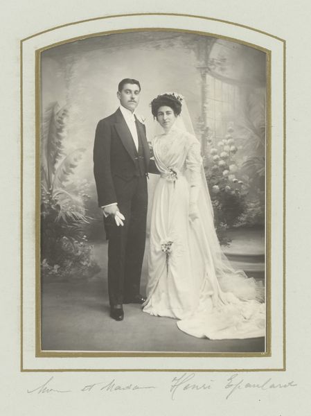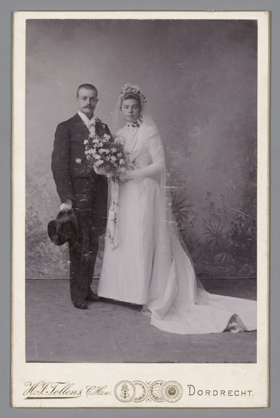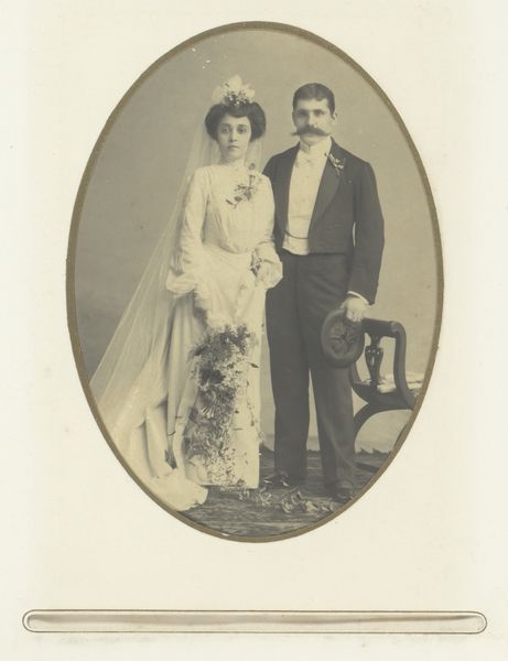 Curator: This captivating photograph, entitled "Bruidspaar", or "Wedding Couple", dates to between 1929 and 1930. The artist remains anonymous. Editor: My first impression is one of a faded elegance. The monochrome palette gives it a timeless feel, but also, a certain emotional distance. The tight framing almost isolates the couple. Curator: Precisely! The photograph's formal structure compels our attention. Note the carefully balanced composition: the stark geometry of the building behind contrasts subtly with the soft textures of the bride’s tiered gown. It is also interesting to see how the textures create layers with tonal consistency. Editor: And look at the social context of the era. In the late 1920s, photography was becoming increasingly accessible. We see a democratization of portraiture, no longer confined to the elite. This photograph documents an intimate moment of union amidst the rapid social and technological changes of the interwar period. Curator: Indeed, that nascent accessibility shifts the very nature of photography, becoming almost instantaneous, capturing fleeting moments more spontaneously and with greater realism, which can certainly be said about this photo. Note how the lighting softly illuminates their faces, rendering visible every delicate detail and nuance. This contributes to the immediacy and emotional directness we've discussed. Editor: This couple likely wanted to preserve this moment to record their contribution to social continuity through their union, conforming to prevailing social expectations for marriage and social structure. Furthermore, one might explore the couple’s agency in presenting a carefully constructed self-image in the burgeoning culture of image consumption of the era. Curator: Well put. And in analyzing the composition and careful balancing of light, shadow, form, and tonality in its structure we discover an intriguing tension between the formality of a portrait and its informal accessibility due to the burgeoning social interest in photographic portraiture. Editor: Precisely! Understanding how an artwork serves as an artefact of broader societal narratives significantly enriches our understanding of culture and how cultural changes affected both the production of images as well as public views about how such photographs should represent social issues and practices such as marriage. Curator: A fitting synthesis to capture how this relatively simple black and white photograph nonetheless exemplifies sophisticated visual art qualities while opening dialogues concerning the nature of photography's evolving place in an increasingly modernizing society.