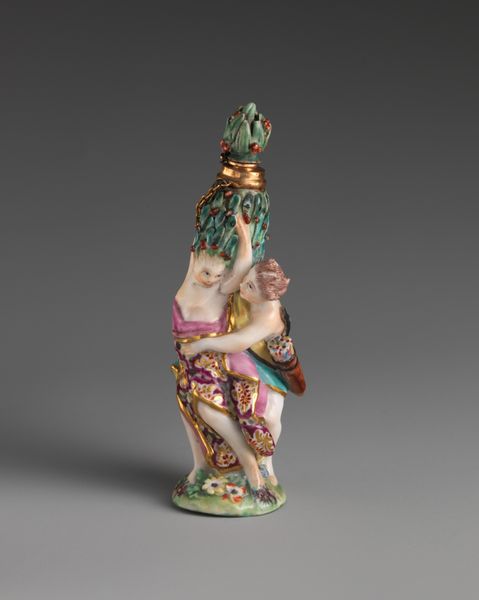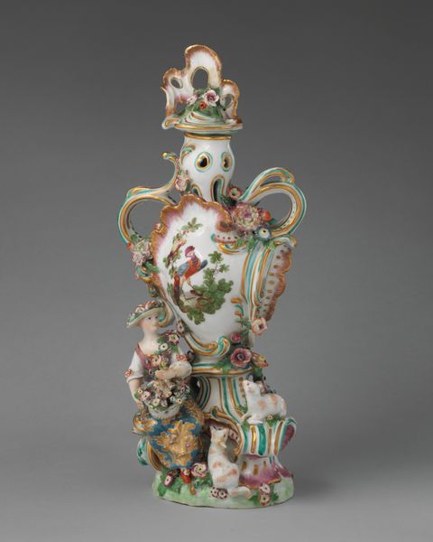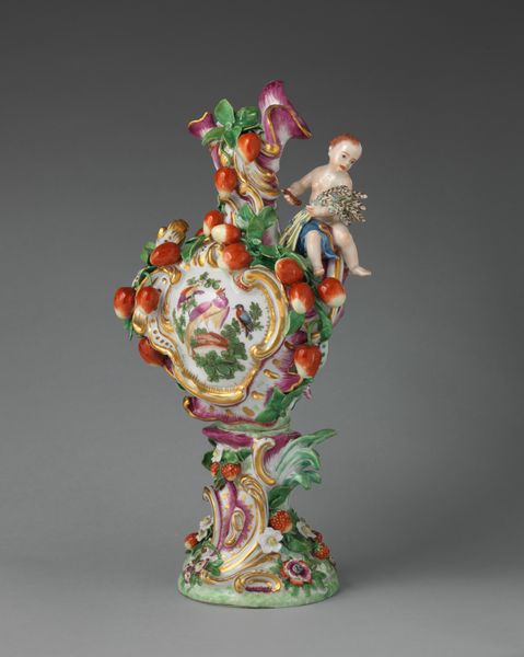 Editor: Here we have a porcelain vase, crafted between 1755 and 1765 by the Chelsea Porcelain Manufactory. It’s currently housed in the Metropolitan Museum of Art. The ornamentation, especially the cherub and the vibrant grapes, gives it a playfully decadent feel. How do you interpret this piece? Curator: Well, it’s crucial to recognize the Rococo style of this piece not as mere ornamentation, but as a reflection of its time, specifically, the pre-revolutionary aristocracy in France and England. Think about what this object *meant* to those who owned it. How do we see notions of class, wealth, and even privilege made manifest? Editor: I see your point. It’s definitely more than just a pretty vase. The cherub eating grapes almost feels symbolic of that aristocratic indulgence. Curator: Precisely. The allegorical depictions of abundance, the birds… consider them a carefully constructed statement of power and affluence. Even the material – delicate porcelain – speaks volumes about access and trade during that era. Editor: It's fascinating how much historical context is embedded in what initially appears to be just a decorative object. Were there specific political messages in art like this? Curator: Not necessarily explicit messages, but these objects reinforce the status quo, normalize excess, and promote a specific vision of beauty, elegance and naturalized dominion. This object becomes a form of cultural capital. Editor: I never considered art could function that way. Curator: Looking at decorative arts with this lens allows us to engage critically with the values of a particular period. We can examine how art played a role in legitimizing certain social hierarchies. Editor: I've definitely learned to see past the surface prettiness of decorative objects and explore the historical narratives they tell. Thanks for helping me unpack it! Curator: My pleasure. Let’s keep asking what is just below the surface, always!