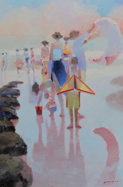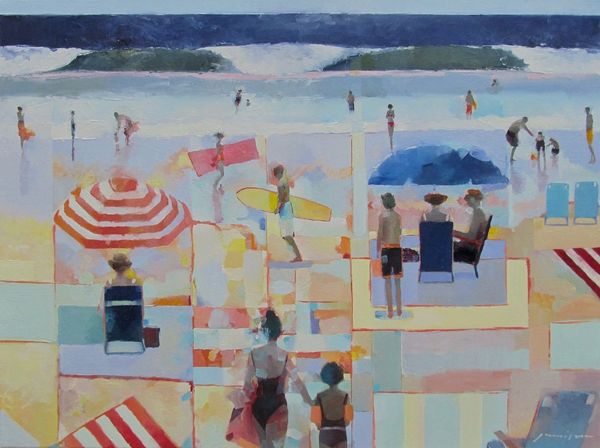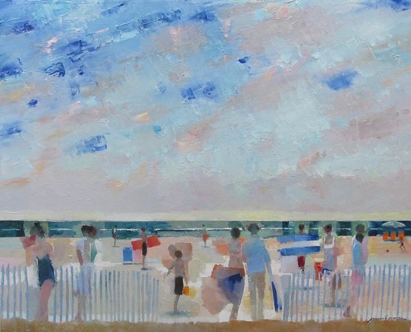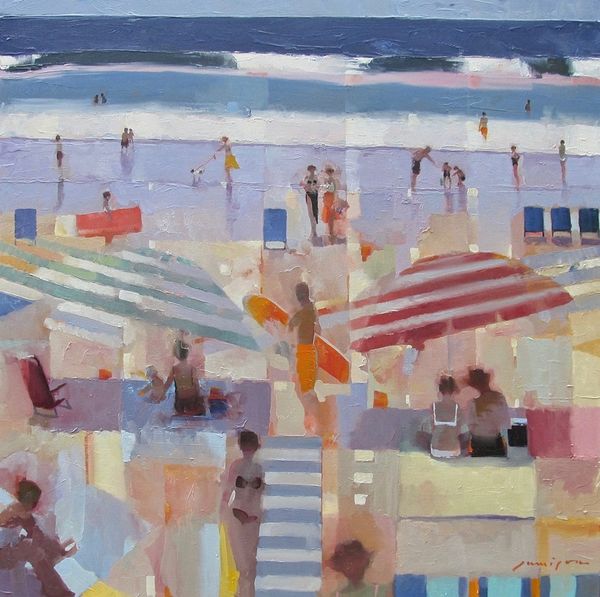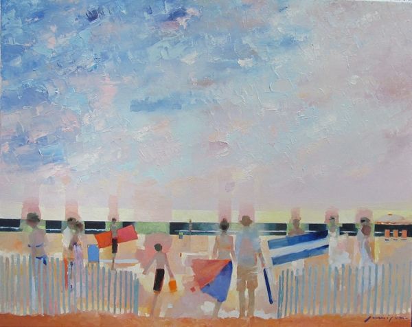 Curator: Stepping into the frame of "At the beach" by Costas Niarchos, painted with oils in what feels like one glorious afternoon en plein air, I'm immediately basking in this landscape's sheer, unadulterated sunlight. What a splash of joyful energy! Editor: Indeed. The overall tonality, bordering on Fauvist with its unmodulated use of colour, strikes me first. There’s a structural dichotomy here—the foreground rendered with short, staccato strokes contrasts the broader, fluid washes of the sea and sky. Curator: I’m captivated by the brushstrokes themselves. Each dab and swipe feels intentional, bursting with an almost childish joy in pure color. Like he simply reveled in laying paint onto the canvas. Editor: The composition adheres to certain Impressionistic conventions. Look at the implied lines guiding the viewer's eye—the beach slopes gently inward, converging towards a horizon that is more sensed than seen, typical of landscapes concerned with capturing fleeting atmospheric effects. Curator: Yet, there’s a delightful sense of disconnect too, isn't there? That scarlet umbrella dominates the foreground—a little haven in a world awash with light—almost as though we’ve stumbled into a memory, vibrant but dreamlike. Editor: Precisely. The artist juxtaposes areas of high chromatic intensity—the reds and yellows—with more muted tones. This contrast is crucial, serving to both energize the composition and create a subtle tension. Semiotically, the umbrella may function as a screen—filtering or mediating our experience. Curator: Or maybe it’s simply an anchor, pulling us into that precise moment in time—smell of sunscreen and the salty air of a summer day? All of a sudden, I want to grab my beach bag. Editor: (Chuckles) Art’s emotional pull is undeniable. Here we observe Niarchos harnessing the formal language of painting, color and composition, to deliver a beachscape vibrating with vitality. Curator: Vitality! Exactly. It reminds you that life, like this beach, is here now, and it’s brilliant. Editor: Yes, even the ephemeral rendered in such deliberate permanence. Thank you for this sunny exploration.