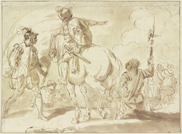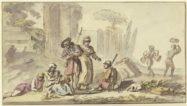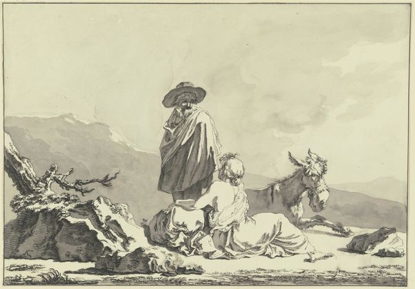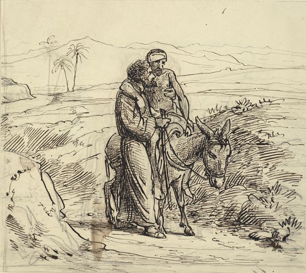 Editor: This is "The Holy Family, among rocks on the road to Egypt," by Wilhelm Marstrand, made sometime between 1810 and 1873 using ink drawing. It definitely strikes me as Romantic, but in a pretty subdued way. What details do you think really stand out, from an art historical perspective? Curator: Well, the spareness of the piece hits me first. I find myself wondering, what's he leaving out? What's implied by the very sketchiness of the scene? Marstrand invites us to fill in the emotional blanks. I mean, look at Joseph’s face – that weariness! It’s palpable, isn't it? Editor: It really is! I hadn’t considered that negative space being used like that... so more emotionally, less practically. Curator: Exactly! And even the landscape itself – those dramatic, towering rocks! Do they protect, or do they threaten? Perhaps both. It speaks to the duality of the human experience – struggle and solace existing side-by-side, don't you think? It mirrors the Holy Family's precarious journey, and by extension, our own lives, our own exiles, metaphorical or otherwise. Editor: Wow, I hadn't thought about it on such a personal level! The "exiles" reading of it – that really opens things up. Curator: Doesn't it? And that’s what makes Romanticism so enduring, I think. It's not just pretty landscapes; it's a mirror reflecting our innermost selves, struggles, hopes, and all! It’s like the artist is whispering, ‘You are not alone in your journey.' A surprisingly modern sentiment, really. Editor: I’m seeing so many new angles now. Thanks for opening my eyes! Curator: My pleasure. Art is such a generous, inexhaustible mirror – the more you look, the more it reveals.