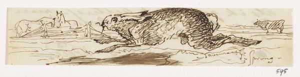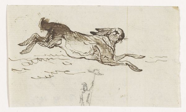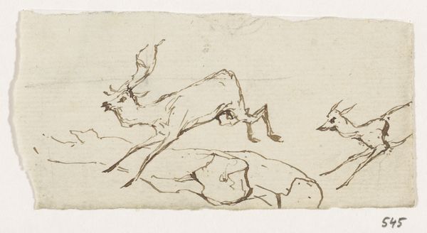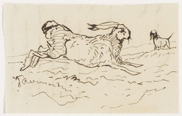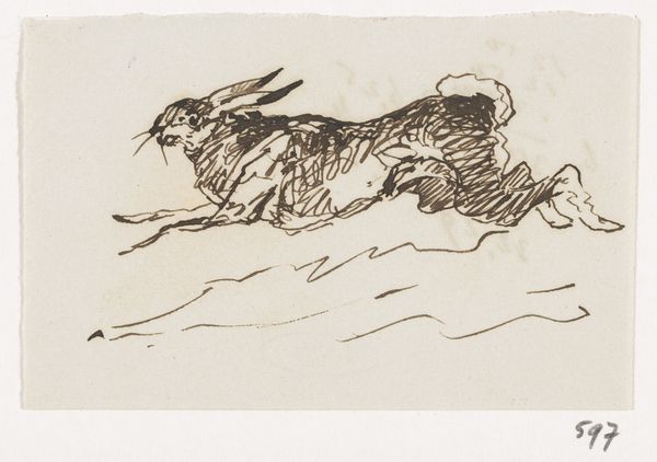 Editor: This is "Hert," a pen and ink drawing by Johannes Tavenraat, dating sometime between 1840 and 1880. It's currently held at the Rijksmuseum. It has such an unrestrained energy, like a fleeting thought captured on paper. What do you see in this piece beyond a simple animal sketch? Curator: This drawing, beyond its surface-level depiction of a deer, speaks volumes about the artistic and societal context of the time. The very act of sketching, a seemingly informal process, was a form of rebellion against the rigid academic art traditions. Tavenraat, through this quick rendering, is perhaps questioning the very idea of representation. Do you notice the almost frantic energy in the lines? What does that suggest to you about the artist's state of mind or even his politics? Editor: I see it now! The frantic lines… maybe a commentary on the anxieties of a rapidly changing world during that period? It's more than just a study of an animal; it's a reflection of broader social and political tensions. Curator: Precisely. Think about the revolutions and social upheaval of the 19th century. Artists like Tavenraat often used their work, even seemingly simple sketches, to express their unease or dissent. This drawing isn't just about a deer; it's a coded message about freedom, escape, and perhaps even resistance. The deliberate choice of pen and ink, readily available materials, democratizes the art-making process itself. Editor: Wow, I hadn't considered that. So, it's a subtle act of defiance through artistic expression. Curator: Indeed. By examining the historical and social context, we unveil deeper layers of meaning. Art becomes a dialogue with the past, challenging established norms and paving the way for future generations of artists to speak truth to power. What have you learned from viewing it through this lens? Editor: That it's always worthwhile to look at art through multiple lenses. Now when I look at it, I see that “Hert” isn't simply a quirky drawing; it represents freedom and social discourse, defying the traditions of the era. Curator: And that is why art matters!