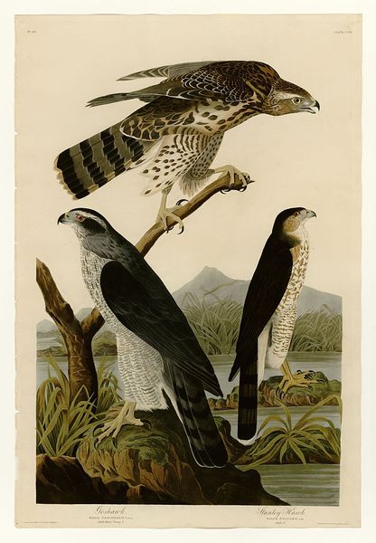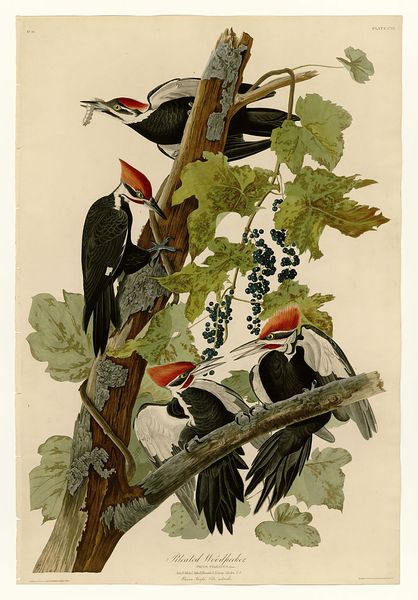 Curator: At first glance, I see graphic precision married with avian exuberance! The strong diagonal composition, achieved with only blacks, whites, reds, and muted earth tones, feels surprisingly vital. Editor: Welcome, everyone. We're looking at John James Audubon's "Plate 66 Ivory-billed Woodpecker". Audubon, of course, spent years documenting North American birds. What resonates with me is how Audubon transforms the woodpecker from simply a bird, into a totem. It seems almost majestic, even totemic. Curator: The black plumage functions as a mask, the stark white markings a form of symbolic body paint. And those red crests practically vibrate with ritualistic power. Don’t you think he's tapping into an archetype there? It's no simple bird; it is a messenger, perhaps a guardian? Editor: Possibly. But let’s consider the line. Notice how crisply the artist captures each feather, the beak, the texture of the bark. These details are essential to the bird's recognizability. While you see totems, I see incredible draughtsmanship prioritizing observable details. His technique actually enhances the illusion of reality while operating on a near scientific scale. Curator: The pose and implied motion enhance the symbolic power. It's caught mid-action; one wonders, is it actively building, or simply surveying its domain? That tension heightens its mystique and alludes to this woodpecker’s association with ancient wooded regions, where nature's creative spirit thrived. These symbolic placements suggest so much more than simple ornithological study. Editor: I admit there’s a dance here— between careful study and artistic license. I concede the positioning creates implied narratives, almost like staged theatre. Consider its implications for conservation, because he painted them before widespread environmental changes endangered the species. Curator: That, precisely, adds to its power! Now, sadly, this bird exists as a memory, amplified through art. Editor: A reminder then, meticulously observed and recorded. We have examined this bird through the different ways in which reality and symbol inform one another. Curator: Exactly, which might lead each of us towards a broader reflection regarding humankind’s connection to our disappearing natural world.
