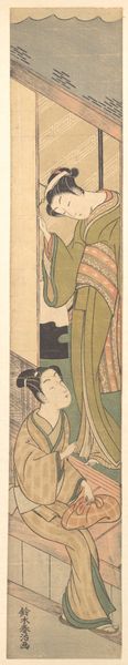 Curator: Here at the Rijksmuseum, we're fortunate to have this striking woodblock print by Torii Kiyonaga, made between 1779 and 1783. The title translates to "Two Courtesans Looking Aside Under a Blossoming Cherry Tree." Editor: My first impression is one of gentle melancholy. There's a poised stillness about the figures, despite them both looking slightly away, their gazes directed elsewhere. It's a composition layered with a sense of subtle yearning, and maybe even world-weariness. Curator: Yes, the figures definitely convey an air of detachment. Kiyonaga, as a master of ukiyo-e, excelled in depicting the elegant fashions and social milieu of Edo period Japan. He likely inherited an acute understanding of woodblock printing as a commercial art; consider how his meticulous line work emphasizes the textile patterns of the women’s garments and also the blooming tree as material and design. Editor: The cherry blossom is, of course, laden with symbolic meaning in Japanese culture. Beyond its beauty, it speaks of transience, a bittersweet acceptance of life's ephemeral nature. The courtesans themselves embody this, existing in a liminal social space, both admired and constrained. Curator: Exactly. The creation and dissemination of prints such as these served a critical function within that commercial ecosystem, which served a spectrum of the Edo society that both supported, fetishized, and looked down on sex workers as both outside of society, but totally bound up in the capitalistic engine of it. There is such a fascinating tension built up in what the material practices of the production reveal to us about the people who would consume these things, and in what social context. Editor: The angle is crucial. Notice their upward glances are nearly identical, hinting perhaps that they share something, some experience. We have these silent connections that underscore the social fabric here represented; or perhaps even a shared resignation, framed as it is beneath the weight of those transient cherry blossoms. Curator: Yes, Kiyonaga’s craft draws our attention not just to who these women *were* materially— but *are,* iconographically speaking: women defined by, adorned by, and employed as beautiful aestheticized surfaces, even now. It's all subtly woven together. Editor: I find that incredibly thought-provoking. This print really does encapsulate the beautiful and ephemeral, both in its subject matter and in the enduring legacy of its imagery. Curator: Absolutely. And from a materialist perspective, it shows the depth and breadth of understanding that Kiyonaga must have had to create and print these pieces with a clear view on his potential audiences. The tension alone creates intrigue and desire for ownership.