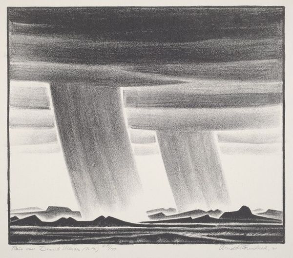 Editor: Here we have Paul Landacre's "Coachella Valley," a woodcut print from 1935-36. The geometric, almost rhythmic, quality of the carved lines, particularly in the sky, really catches my eye. How do you see this work operating within its historical context? Curator: Considering Landacre's "Coachella Valley" through a historical lens, it’s important to examine the public role of art during the Depression era. Does the geometric style strike you as echoing any prevalent design trends of the time? Editor: You know, now that you mention it, the art-deco elements are fairly apparent. It almost looks like something created for the WPA. Curator: Precisely. The stark contrasts and dramatic light could be seen as reflecting a certain social consciousness, perhaps even anxieties, about the rapidly changing landscape and the human impact on it. The idealization of the valley flattens into geometric stylization here. In what way does it communicate the relationship between nature and the viewers of this scene? Editor: The lack of any human figures gives me the sense of sublime awe. The land is both imposing and silent, and maybe indicative of larger themes of loss due to our destructive behaviours, which you already pointed out. What is its function for people today? Curator: In contemporary terms, this print might remind us of our relationship to environmental concerns. It becomes a visual touchstone for conversations around sustainability and how we curate nature through cultural imagery. Are we preserving or exploiting? Editor: That's a really insightful connection. I had never considered the sociopolitical implications of landscape art so explicitly before. Thanks! Curator: The value of art lies in understanding its past to illuminate our present and inform our future. It’s about seeing how cultural narratives shape the way we see the world, even in something as seemingly simple as a landscape print.