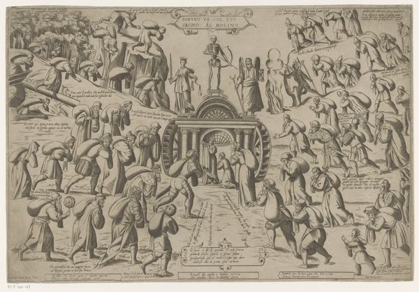 Cornelis Bos created this engraving, "Adoration of the Golden Calf," around 1541. The composition divides into distinct zones, with Moses descending from the mountain at the upper left, contrasting the revelry below. The idol, centrally placed, is the focal point, around which figures gesture in worship, creating dynamic, swirling lines. Bos masterfully uses hatching and cross-hatching to create tonal variations, giving depth and volume to the figures. This contrasts sharply with the clean, spare lines used to depict the landscape. Bos employs a semiotic language, the golden calf symbolizing idolatry against the divine law of Moses, which is reinforced by the separation in the upper and lower sections. The figures, with their exaggerated gestures, convey a sense of chaos and moral decay, challenging the established religious values. The visual disarray embodies a critique of religious transgression and the breakdown of order.