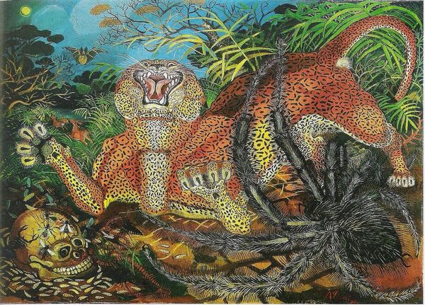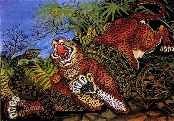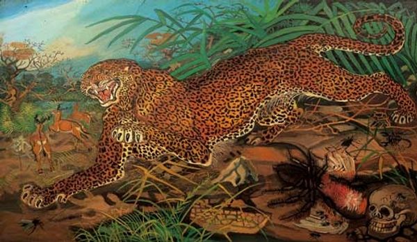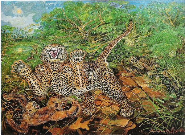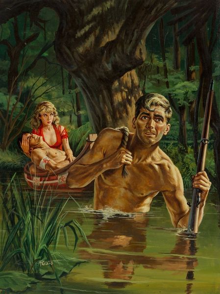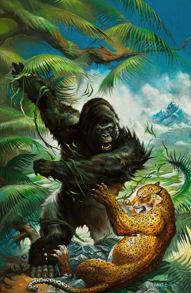 Mort Künstler painted this cover for Adventure Magazine, and it's like a scene ripped from the most pulp-tastic jungle adventure you could imagine. The way he builds up those layers of greens and browns in the jungle, it’s all about creating a mood, a sense of being overwhelmed by nature, or maybe by your own testosterone fueled hubris! Look at how the leopard's spots are dabbed on, almost like he’s using pure color to build form. And the way the water is rendered! It’s not just blue, it’s got this frothy, agitated surface, like the whole scene is vibrating with danger. Then you have the highlights of those crocodile teeth. It makes me think of someone like Basquiat, but from a completely different angle, or maybe someone like Guston, embracing the cartoonish, but with killer instinct. It's that tension between the skill and the slightly unhinged energy that gets me. It's a reminder that art doesn't always have to be serious to be seriously engaging.
