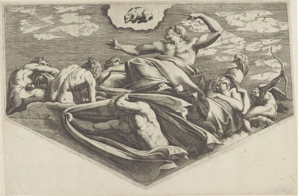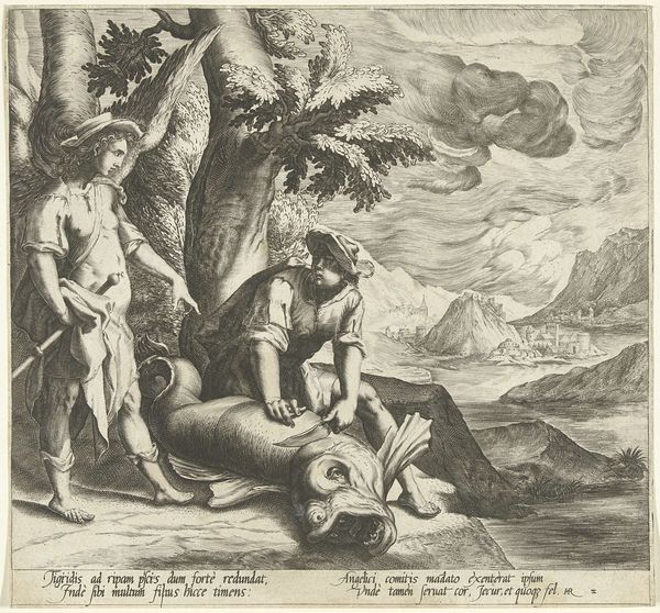 This engraving, ‘Scylla fleeing Glaucus’ was created by Crispijn van de Passe the Younger. It shows the nymph Scylla as she escapes the sea god Glaucus. The composition is strikingly divided: to the left, Glaucus and other sea figures frolic in a dynamic seascape with ships on the horizon, rendered in delicate lines. The right side contrasts sharply, where the static figure of Scylla is depicted in the darker, more densely etched grotto. This juxtaposition serves not just to tell a story but to highlight a tension between movement and stasis, desire and flight. Look at how the artist uses hatching and cross-hatching techniques to create contrasting tones. This use of light and shadow enhances the drama, pulling the viewer's eye between the pursuer and the pursued. The structured arrangement of figures and landscape, divided into distinct, yet interconnected spaces, suggests a deeper commentary on the dynamics of power, fear, and transformation. This print invites a continuous, active interpretation.