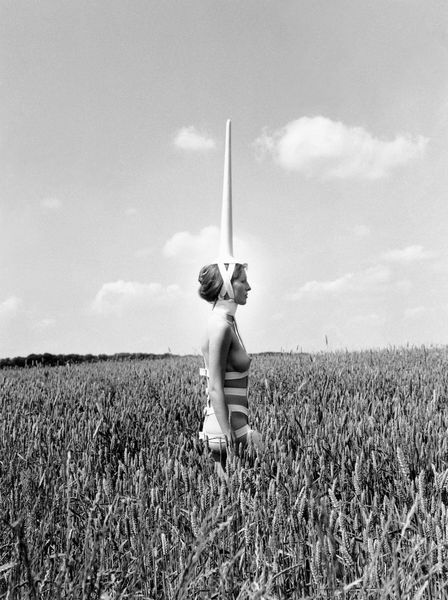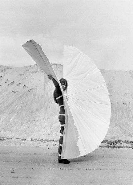 Editor: Here we have Rebecca Horn's "Movable Shoulder Extensions" from an unknown date, currently housed at the Harvard Art Museums. The stark black and white image really emphasizes the unusual verticality. What catches your eye in this piece? Curator: The formal rigor is immediately apparent. Note the stark contrast, the figure bisecting the landscape, and the geometry of the extensions themselves. How does the extension's rigid form interact with the body's movement through space? Editor: It feels almost alien, a strange modification. The way they extend beyond the body is disorienting, like it's challenging the definition of "human." Curator: Precisely. The extension becomes an integral part of the body, yet disrupts its conventional form. It invites consideration of altered states of being. Editor: I never thought of it that way, it's like the extensions are redefining physical boundaries. Curator: Indeed, and challenging our perceptions of the corporeal form.