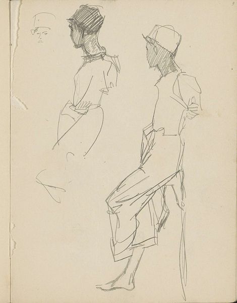 Curator: Here we have John Singer Sargent's "Sketches of Three Soldiers," a work of uncertain date housed at the Harvard Art Museums. It's rendered in pencil on paper. Editor: The first impression is one of immediacy; the rapid strokes convey a sense of weariness, the weight of duty apparent in their posture. Curator: Indeed. Sargent's command of line and form is evident. Note the contrast between the defined facial features of the soldier on the right and the obscured faces of the others. It’s a study in perspective and hierarchy. Editor: I see it more as a focus on labor. The materials—the heavy packs, the rifles—and the anonymity of the majority emphasize the collective experience of soldiers, the shared burden of war. Curator: I disagree. The subtle variations in line weight and the deliberate composition elevate it beyond mere documentation. It’s about capturing the essence of the individual within the uniform. Editor: Perhaps. But for me, the impact lies in its representation of mass conscription and the lived reality of soldiers in their uniforms. The sheer weight of their kits is palpable. Curator: Ultimately, Sargent's skill leaves us contemplating both the individual and the collective. Editor: Yes, the drawing speaks volumes about the tools and sacrifices inherent in war.