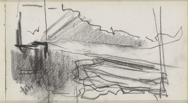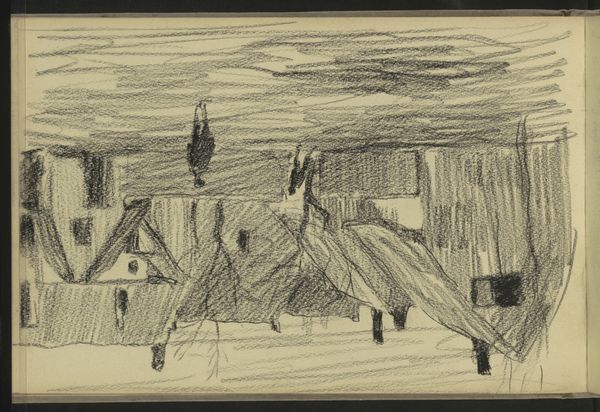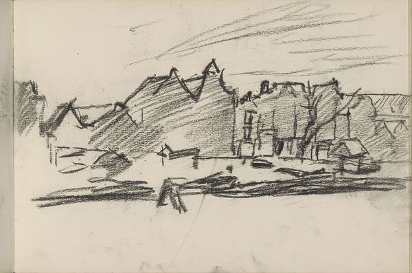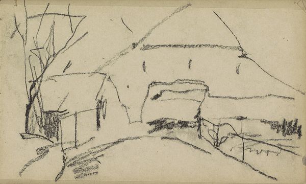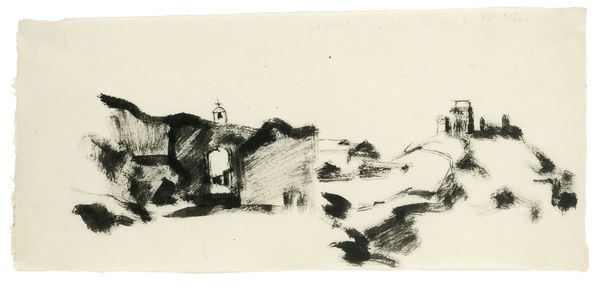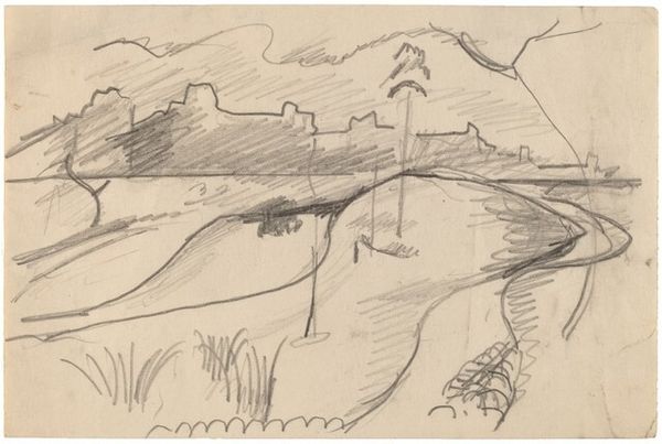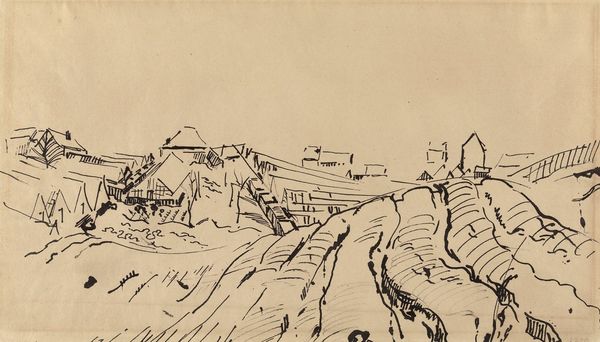 Editor: This is Walter Gramatté's "Barracks," created in 1916 using etching. The sharp, almost frantic lines give the cityscape an anxious quality. What do you make of this print? Curator: From a materialist perspective, the etching process is key. Consider the labor involved, the acid biting into the metal plate, the physical act of printing. Gramatté isn't just depicting a cityscape; he's engaging with the means of its production. The stark monochrome removes any color distractions, so what remains are lines of production, of the cityscape and the artwork itself. Notice how the composition emphasizes the harshness of the landscape leading up to the Kaserne and how these lines dominate much of the imagery, creating almost as much 'field' as is taken up by the city structures. Editor: So the process itself becomes part of the statement? The bleakness extends beyond the subject matter. Curator: Exactly. The medium informs the message. Think about the social context: 1916, the height of World War I. Barracks represent military power, but this etching presents them as stark, almost fragile, structures within a ravaged landscape. Editor: It’s a critique, perhaps, of the war machine? Curator: A strong argument could be made to read it that way, particularly when considering how the landscape and built structures have little differentiating line quality. Both are expressed by harsh angles, one indistinguishable from the other. How the city comes from, or returns to, the environment it sits on. Consider the role of the etching itself—its relative inexpensiveness allowed for wider dissemination, making potentially subversive ideas accessible. Editor: I never thought about the affordability influencing the message itself! Curator: It highlights the means of distribution and how materiality can affect social impact. Hopefully that gives some insights into how we can analyze art through a materialist lens.