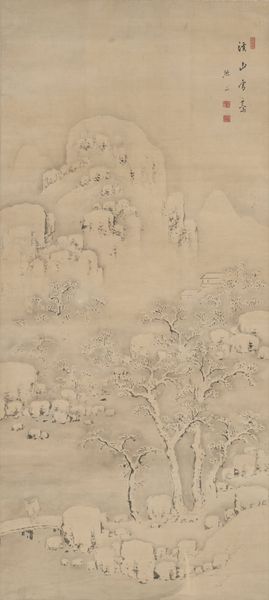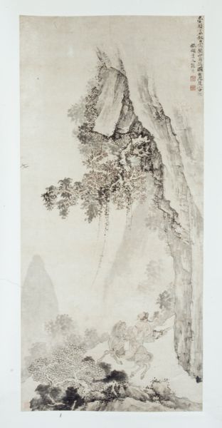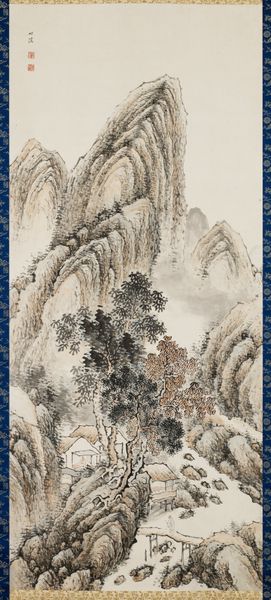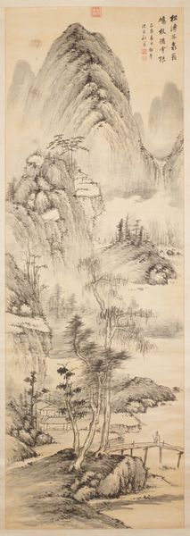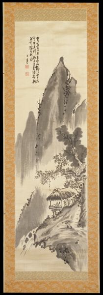 Editor: This ink drawing from 1844, “Autumn Thoughts on a Garden Landscape” by Nukina Kaioku, is so delicate. The washes of ink create a really atmospheric feel. I’m curious, what strikes you about this piece? Curator: It’s the deliberate labor, the very process of its making, that compels me. Kaioku's choices of ink and paper—materials sourced, prepared, and then carefully manipulated—tell a story of craft deeply intertwined with cultural values. Notice how the ink bleeds and feathers. What does that suggest about the paper and the consistency of the ink? Editor: That's interesting. I hadn't thought about the material properties affecting the outcome so directly. It does seem like he really understood his materials. The texture in the mountain suggests a coarser paper perhaps? Curator: Exactly. This suggests an awareness of how the material impacts the aesthetic and conveys meaning. It’s not simply about representing a landscape, it’s about the act of representation, of using readily available means to create something culturally valuable, while maybe alluding to traditional craft. Think about how the context—where these materials were sourced and by whom—influences how we should interpret its intention. Editor: So, you’re saying the value of the work isn’t just in the image but in understanding the cultural context of its creation, and who would have consumed it? How its materials were part of daily life? Curator: Precisely. And to consider how Kaioku is perhaps recontextualizing, critiquing, or affirming social values through his material choices and application. It moves us away from only regarding ‘fine art’ and asks us to value the materiality and labor, much like in any other craft. Editor: That gives me a completely different perspective. I was so focused on the visual, I hadn’t considered the deeper connection to its production and social life. Thanks, that's incredibly helpful. Curator: Absolutely. Looking at art through the lens of materials, labor, and consumption can reveal a richer, more complex narrative.
