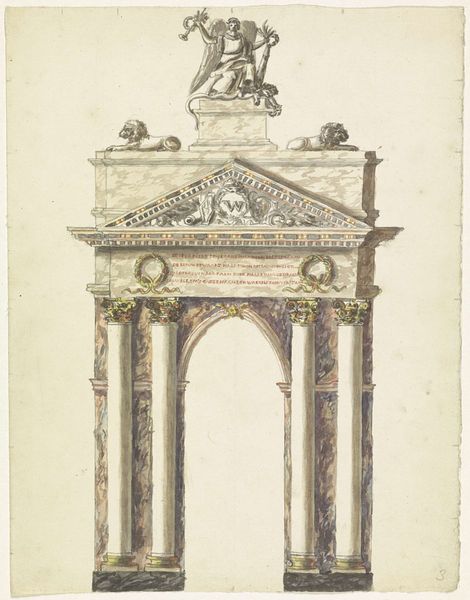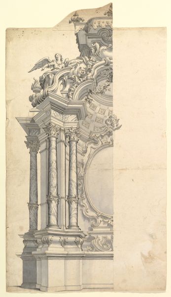 Curator: So, we’re looking at “Two Alternate Designs for a Doorway,” dating roughly between 1730 and 1760, currently residing at The Met. It's attributed to an anonymous artist, rendered in colored pencil. What's grabbing your attention right away? Editor: It has such an inviting emptiness! A frame to nowhere, and I can’t help but think of how much the doorway, even as a threshold, signals power. Curator: Precisely. The doorway as a status symbol! Think of the baroque period. Extravagance wasn't just decorative; it was performative, meant to broadcast wealth and influence. Editor: Yes! You see this riot of ornament capping those cool marble columns; the whole effect really turns up the volume, doesn’t it? Not so much subtle but making its presence known in a room and almost acting like its own building within. Curator: I think this design serves its role in broadcasting access and authority. I mean, envision this doorway in a grand salon. Suddenly, the act of passing through becomes an event. This drawing also makes me think of how architectural design functioned through these periods: Prints like these would allow patterns to diffuse outwards as ideas of architectural trends spread. Editor: And maybe that anonymity even adds a layer – an almost folk quality. Because then, so many interpretations could rise across time in social structures and homes as it got absorbed into the everyday life of interiors. It seems like it wouldn't necessarily belong to just one originator’s sense. Curator: Indeed. The artist remains unnamed, allowing the design to morph across settings and applications. It points towards a fluidity and shared creative ethos common across architecture as a discipline, and design in the baroque period overall. Editor: Mmh, what began with an idea of something quite grand and stately could eventually inhabit the intimacy of some small chapel; who could tell! Well, thinking of this in this perspective definitely opened up the artwork on new planes for me today. Curator: Agreed, this doorway, although initially striking in its exuberance, it makes us think about accessibility, appropriation, and the beautiful messiness of inspiration over time.