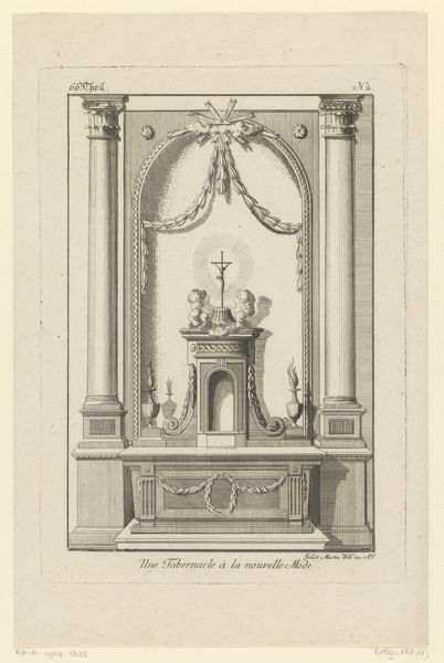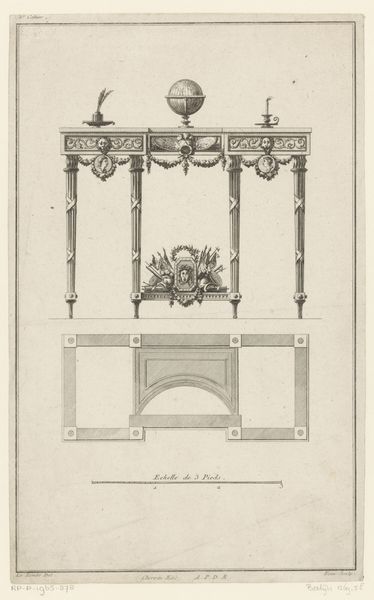This drawing, "Design for Mantlepiece," was created by Antonio Francisco Baeta using graphite and gray wash, likely around the turn of the 20th century. The design presents a symmetrical façade, structured by classical elements and rendered in meticulous detail with its architectural components. Consider the form of this piece: the cool grays and precise lines lend an air of stately elegance to the design. The mantlepiece's structure is articulated through vertical pilasters topped with decorative capitals, flanking a central panel which suggests a mirror. Ornamentation such as carved figures and floral motifs enhance the surface, adding layers of visual texture. The composition is hierarchical, drawing the eye upwards from the hearth to the ornate pediment. The piece engages with historical styles and conveys the social values attached to the interior space. The design could be seen as a semiotic representation of power and taste, intended to evoke an atmosphere of refinement and classical learning. As a design, it challenges established notions of interior design, inviting viewers to contemplate the interplay of space, status, and aesthetic expression within the domestic sphere.