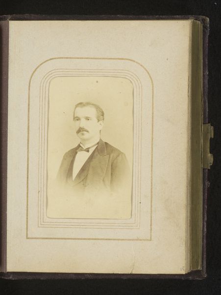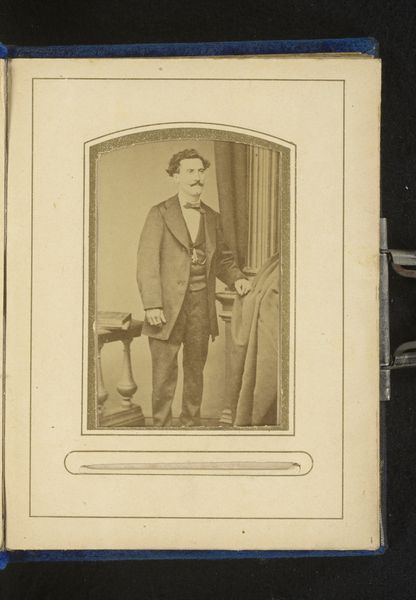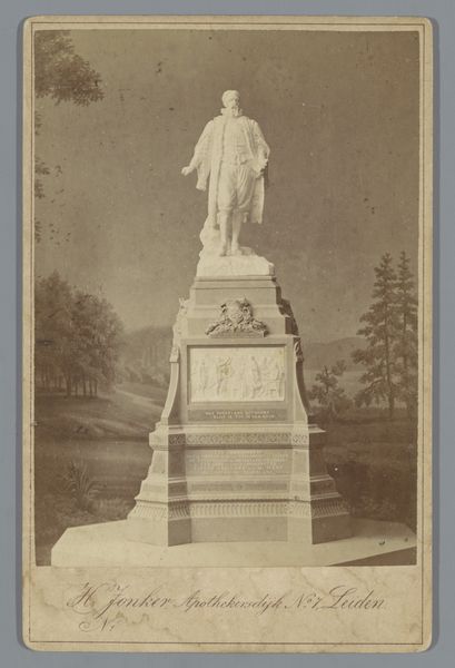 Editor: This lithograph from 1887, "James Gordon Bennett, The New York Herald," part of the American Editors series by Allen & Ginter Cigarettes, presents an intriguing juxtaposition of portraiture and landscape. It almost feels like a diptych within a single card. What catches your eye in terms of its composition? Curator: The division is indeed key. Observe how the picture plane is split—the idealized landscape with the obelisk offering a sense of timelessness, contrasted with the rigid, framed portrait and newspaper segment. This creates a deliberate tension, setting up an interesting interplay of gazes, since the implied eyeline leads from the distant structure into Bennett’s presentation of journalistic work. Do you notice how this construction highlights a power dynamic, not just of subject within environment but between distinct pictorial modes? Editor: It seems to say something about how identity and place can coexist. The cool hues of the left-hand image contrast with the warmth of the right. Is that contrast just aesthetic? Curator: The strategic deployment of chromatic contrast significantly bolsters the visual structure. Consider the cool blues and greens that suffuse the left panel versus the warmer, almost sepia tones that define the portrait. This division furthers the idea of objective public presence versus the more intimate private persona implied in Bennett's composed depiction. Could this be suggesting his public identity overshadows the physical place, emphasizing his influence in the world over mere physical location? Editor: That's fascinating. I hadn't considered the symbolic weight of the colour choices and implied relationships! This reminds me to analyze formal structure much more. Curator: Indeed, careful attention to composition can unlock complex narratives that extend far beyond the initial surface appeal.