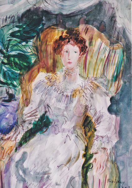 Curator: So, here we have Emilio Grau Sala's "Flicka med parasoll," or "Girl with Parasol," created in 1937. Editor: What a dreamy concoction! It feels like a half-remembered picnic in a park. There's a wistful, almost melancholy mood hanging about it, don’t you think? Curator: Indeed, it’s a rather evocative piece. Notice how Sala uses watercolor, an interesting choice to portray a fleeting moment. See how the dappled light suggests the "plein-air" aesthetic with its direct observation of nature, blurring the boundaries of Impressionism with a hint of Romanticism, would you agree? Editor: Absolutely. The light isn't just light, it's an emotional wash! Look how it dances across the figure’s dress—those stripes aren't just pink; they’re infused with a transient sweetness, which adds to that overall feeling. And what's going on in the background with that ghostly figure on a horse? Curator: Ah, that ghostly rider adds a layer of narrative ambiguity. The "flâneur" becomes an ethereal observer, fading in a background which suggests cityscapes that have elements of the romantic in them. I wonder if that figure signifies the relentless march of time or maybe something more…fantastical? The contrast with the immediate and definite figure in the foreground enhances this surreal feel. Editor: Good point. Perhaps time and memory intertwining... In the main figure’s poised demeanor there seems to be an eternal echo. So we end where we began— with a melancholy, yet lingering moment! Curator: Yes, it's an invitation to interpret beyond what's visibly rendered on the painting surface, that pushes into narrative, feeling. Grau Sala’s talent was in capturing these sentiments, this fleeting feeling of existing between waking and dreaming states.