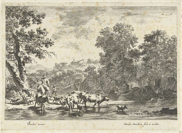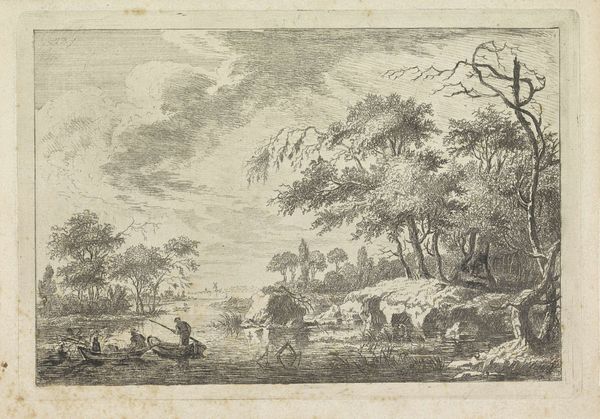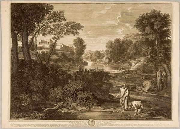 Curator: This etching, by François Nicolas Barthélemy Dequevauviller, pictures the Course of the Crati and the Valley where Sybaris once stood. It's rendered in a precise, almost dreamlike style. Editor: The tonal range is quite striking. See how Dequevauviller uses delicate lines to suggest both depth and atmospheric perspective? It’s very controlled. Curator: Indeed. The scene evokes a sense of classical grandeur, perhaps referencing the lost civilization. Consider how the figures are arranged, almost like a frieze against this landscape. Editor: The composition leads the eye from the foreground figures, across the river, to the distant mountains, creating a balanced yet dynamic visual experience. It is very skillful. Curator: Absolutely. And the ruins are positioned just so, reminding us of cycles of civilization and decay. Sybaris was famed for its opulence, a cautionary tale about wealth and ruin. Editor: The visual rhythm throughout the scene really holds it together. I find it quite captivating how the artist manipulates light and shadow within the constraints of the etching technique. Curator: Looking at this print, one is struck by how much emotion can be conveyed through careful detail and considered composition. Editor: Agreed, and it makes one appreciate the beauty and skill of etching as a medium.