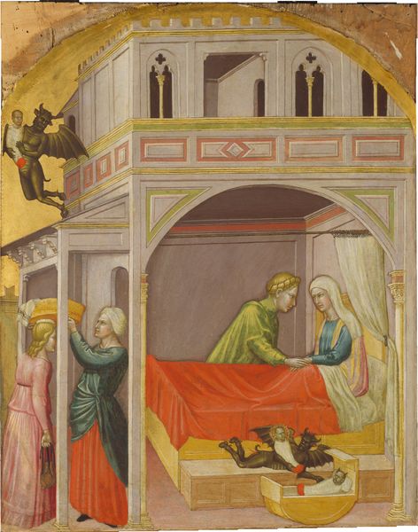 Giovanni da Milano's "Orazione nell'orto" presents a complex interplay of color and form within a seemingly simple narrative scene. The work is structured into distinct registers, defined by shifts in spatial logic and color saturation. Above, Christ kneels, a vision in pink and blue set against a shimmering gold ground. Below, the sleeping disciples are framed by dark trees. This division emphasizes a hierarchy, both visually and spiritually, between the divine and the earthly. The architectural forms on the left, rendered in muted tones, add a layer of structural depth, yet remain subordinate to the emotionally charged scene unfolding in the upper registers. The composition invites us to consider how da Milano uses color not merely decoratively but as a means of constructing meaning. How does the gold ground, for example, function as a signifier of the sacred, while the darker hues below suggest a space of slumber and unawareness? This painting is less a straightforward representation of a biblical scene and more a carefully orchestrated meditation on faith, doubt, and divine presence.