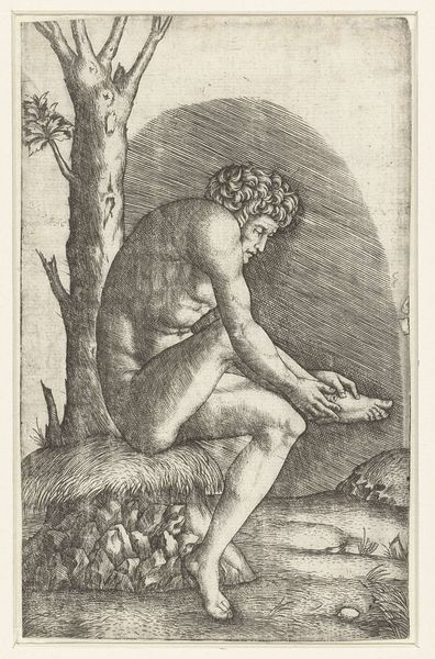 This tiny engraving, "Sater woman playing bagpipes," is of unknown date and was made by an anonymous artist. It currently resides in the Rijksmuseum. The density of lines and the sharp contrast between light and shadow create a striking visual texture. The artist uses dense hatching to define form, giving a tactile quality to the satyr woman’s muscular build and the leathery texture of the bagpipes. Note how the composition leads your eye in a circular motion, from the satyr's head down to the pipes and then around the body. This formal structure may point to a subtle critique of established visual hierarchies, undermining traditional binary oppositions such as human versus animal, or male versus female. The bagpipes, with their phallic shape, further destabilize conventional symbolic associations. The piece challenges us to reconsider our notions of beauty, form, and the boundaries of representation. Art becomes a site for questioning and reinterpretation.