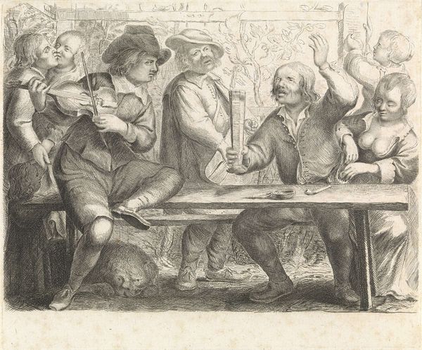 Curator: Ah, this is "A Merry Company" by Jan van Hemessen, created around 1540 using oil paints. It's quite a complex genre painting, offering a glimpse into 16th-century social life. Editor: "Merry" seems… ironic. My first impression is definitely unease. The composition is chaotic, divided into two distinct but interconnected spaces. The tilted perspective only amplifies that sense of disorientation. Curator: Absolutely. Hemessen here reflects a rising interest in moralizing genre scenes. We see various states of intoxication and questionable behavior that resonate with the anxieties around social disorder in that period. This kind of representation offered a way for viewers to contemplate the repercussions of unbridled indulgence. Editor: I notice how the light source is unclear. Certain figures and faces emerge with stark clarity, almost aggressively so, while others dissolve into shadow. Notice, too, how the textures shift between rough rendering, like in the background scrawls and almost Flemish detail in the foreground figures. Curator: Yes, the details speak volumes about contemporary customs, expectations and morality. Look closely at how some characters are isolated, suggesting their alienation or exclusion, while others are very deliberately paired together. Editor: The symbolism here feels overt; the birdcage and drunken collapse speak to a moral message, sure, but they seem to overwhelm rather than invite deeper visual analysis. Curator: Yet, consider that Hemessen himself lived in a rapidly changing world. Artistic representations, particularly those meant for public viewing, acted as both critiques and tools for social cohesion and definition during the era of religious reformation. Editor: I find the emotional register conflicted – humour struggling with a darker tone, even violence. In its spatial and atmospheric organization, it achieves more tension than coherence, maybe reflecting this artist's inner anxieties in this complicated context. Curator: It’s this collision of everyday life with broader social anxieties that truly fascinates me; Hemessen's artistic choices serve as potent historical commentary. Editor: I leave with a better appreciation of the painting, though its appeal for me resides in how unbalanced I find it on both visual and symbolic registers, making the depicted disorder not so historical after all.