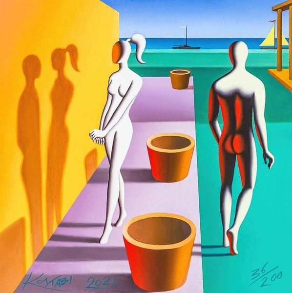 Mark Kostabi's, *Summer Breeze*, captivates with its smooth surfaces and vibrant color palette, composed of yellow, red, and blue gradients. The painting features two stylized figures embracing under a crimson parasol, set against a seascape with sailboats. Kostabi destabilizes traditional notions of identity through his figures. They are faceless, and rendered in stark, contrasting tones, which prompts a questioning of the individual's role within social structures. The beach setting, with the beach ball, and a sun hat, evokes leisure, but also hints at deeper themes of alienation and the loss of individuality in modern society. The painting's flattened perspective and absence of depth further emphasize its artifice, challenging fixed meanings of space. Through these formal qualities, Kostabi creates a dialogue about the self and its relationship to culture. The canvas becomes a site for exploring how we construct meaning in a world saturated with coded images.