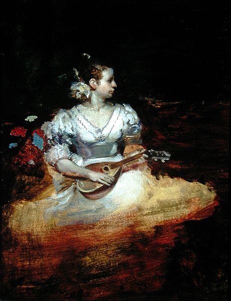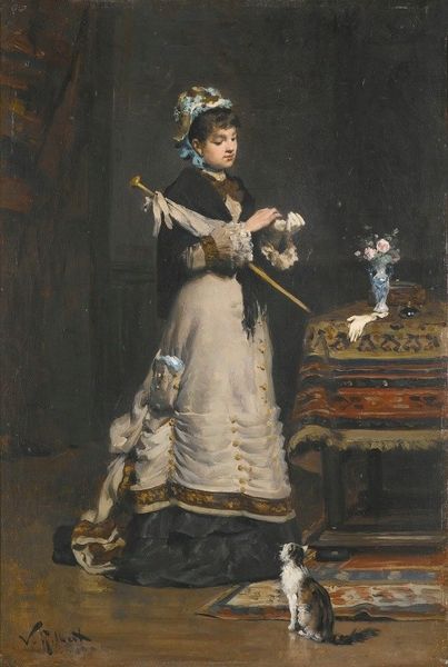 Albert von Keller painted this artwork, Seated Lady with a Book, in 1877. The composition centres on a woman in quiet contemplation, enveloped in a palette of soft browns, creams, and a striking cobalt blue. The brushwork is loose and painterly, creating a textured surface that adds depth to the figure's form. The woman's posture, with her hand delicately touching her face, guides our attention. She is a study in contrasts. The texture of her elaborate slippers and elegant dress hints at her material status, while her introspective gaze suggests an intellectual or emotional depth. The book in her hand becomes a signifier of her inner life, contrasting with the rigid social expectations of women during this era. Keller subtly destabilizes the traditional portrait by not presenting his sitter in a conventional pose of societal presentation. Instead, the artist emphasizes the lady's psychological space as a powerful statement about the evolving roles of women in society, leaving us to contemplate what it means to be both seen and unseen.
