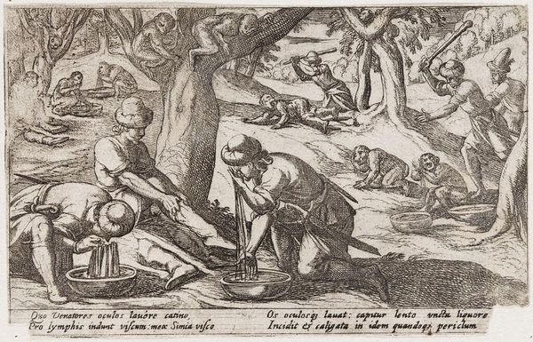 Curator: Looking at this piece, it feels like an incredibly detailed tapestry, almost woven with light and shadow. The textures practically leap off the print. Editor: Indeed. We are looking at Hendrick Goltzius's engraving, "Ruth leest aren in het veld van Boaz", from around 1580, currently held in the Rijksmuseum collection. The narrative unfolds beautifully in this Northern Renaissance style print. Curator: You can almost feel the weight of the materials Goltzius worked with. Look at how he used line, an almost maniacal commitment to tiny lines to render details in this little plate. He creates such a complex depiction with simple strokes of an engraving tool and acid! And observe the level of control and skill necessary to bring a copper plate to this level. Editor: Absolutely. Consider the biblical narrative underpinning this depiction, particularly its historical context. The story of Ruth is an archetypal narrative of kindness rewarded, a social commentary that speaks to community values in 16th-century society. And in the visual depictions of laborers, Goltzius also showcases an interesting contrast between social status and hard work. Curator: What also interests me is how an artwork like this gets made and consumed, as if from the raw metal material into finished art. What kind of workshop allowed a printmaker such resources, the level of technical virtuosity, to create this type of art that would enter domestic and scholarly collections? These lines suggest the degree of specialized training and craftsmanship. Editor: Beyond the process, consider how the presentation and consumption of images shaped moral and social perspectives within society. The printing press was a tool that facilitated knowledge transfer but it could also influence social perception. We can imagine this print would influence ideas about work and ethics in society and private homes across the Dutch Republic. Curator: I'll now see Goltzius’ printmaking output in a different light. To think that "Ruth leest aren in het veld van Boaz" captures a brief instance in the circulation of an idea as a product in society. Editor: And by exploring those ideas and its creation, the artwork provides insight into the visual culture and political messages of its time, which enriches our modern perspective.