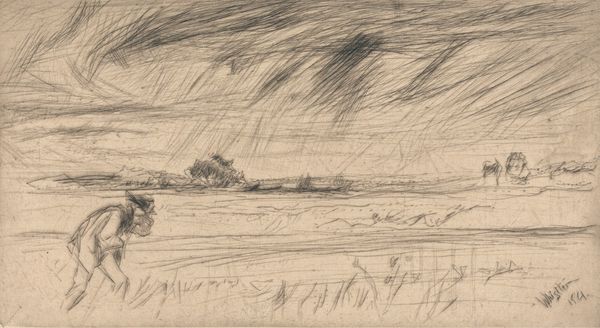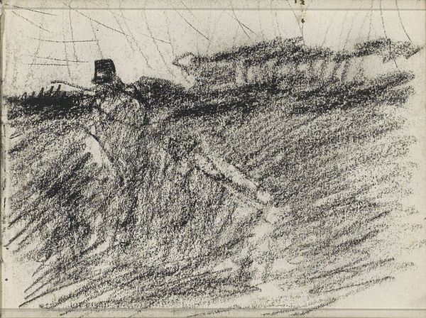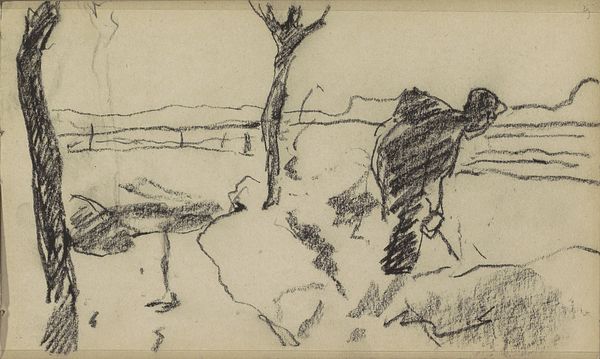 This drawing, ‘Man in a Landscape, Possibly a Peat Worker’ by Willem Witsen, captivates us with its raw, textural intensity. The monochromatic charcoal strokes create a somber mood, with the lone figure nearly swallowed by the landscape. The composition emphasizes a stark, almost barren scene. Witsen uses line and form to create a visual structure that speaks to the human condition. The figure, rendered with bold strokes, appears both connected to and isolated from the land. Note how the strong directional lines of the sky draw the eye horizontally across the image plane, while vertical tree trunk acts as a counterpoint, grounding the composition. The semiotic interplay between the figure and the land is evocative. Is the worker defined by his labor, or is there a more profound commentary on humanity's place within the natural world? Witsen prompts us to ponder the multifaceted relationship between man and environment.