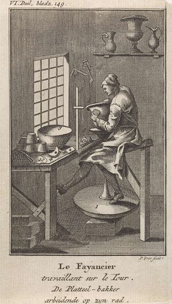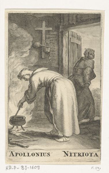 Curator: Welcome. Today we are looking at a print called "A Woman Doing Housework, Plate 5 from 'Five Feminine Occupations'," created sometime between 1643 and 1655 by Geertruydt Roghman. Editor: My first thought is how starkly domestic it is. The composition seems very self-contained, focused completely on this intimate, almost claustrophobic, interior. Curator: Indeed. Roghman has presented a masterclass in rendering texture. Note the meticulous cross-hatching that defines the metal cookware against the smooth planes of the woodwork, achieving a fascinating contrast of light and shadow. Editor: Absolutely, and this focus on daily life reflected broader cultural shifts in the Dutch Golden Age. The rising middle class sought art that depicted their own world, their own values. Roghman is offering a perspective of women within the household economy. Curator: Precisely, although this depiction begs certain questions about gender roles through formalist avenues. Observe the window to the upper-right corner—is this barred division of external space and the heavy shading implying more restrictive conditions within? It serves as a very visible constraint. Editor: It’s intriguing to consider the ways in which economic factors influence artistic themes and also female representation. Prints such as this circulated widely, shaping ideas of female identity and domestic labor during this historical period. Curator: Notice as well how the vanishing point sits right on her back while washing, emphasizing how she supports her body with two hands, pushing the image's conceptual symbolism right into a spatial context. Editor: Perhaps Roghman's print compels us to reconsider what and who is rendered visible—and invisible—within dominant narratives about women in domestic space throughout time. Curator: Precisely, so let’s consider that this small print provides a substantial demonstration of art as historical and symbolic object. Editor: Absolutely—a conversation starter!
