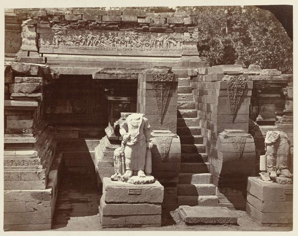 Curator: This image, taken by Colin Murray, shows "Ellora, The Cave of Ramaishwar," at some point during the artist's lifetime in the mid-19th century. There's a striking sense of stillness. Editor: The way the light drapes across the carved figures, juxtaposed with the shadow, suggests the deep time held within these spaces, doesn't it? I wonder about the colonial gaze framing this sacred site. Curator: It's inescapable in 19th century photography from the region. This cave, dedicated to Shiva, became a site of both reverence and anthropological study. Editor: How might the person in the foreground be implicated in this narrative? Is their presence a symbol of resistance, or an element of exoticism for the Western viewer? Curator: Perhaps both, simultaneously. Murray’s photograph freezes a complex intersection of faith, power, and representation. Editor: Absolutely, a single frame holding layers of meaning, a frozen moment in the ongoing negotiation of identity and place.