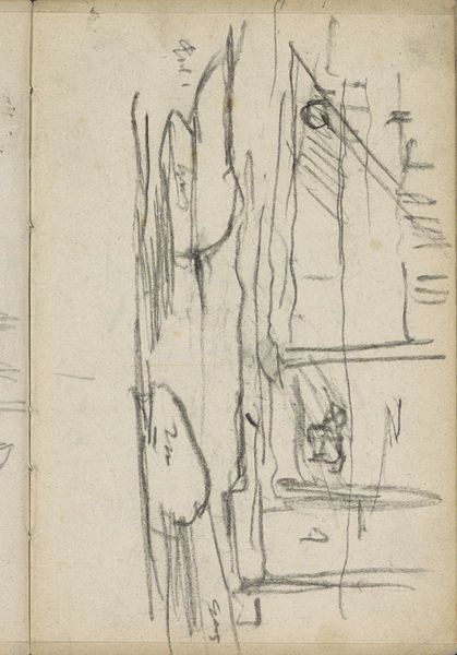 Curator: Here we have "Landschap met bebouwing," or "Landscape with Buildings," a pencil and graphite drawing made by George Hendrik Breitner between 1887 and 1891. It’s currently held in the Rijksmuseum collection. Editor: My immediate impression is one of fleeting observation, a quick sketch capturing a moment in time. The lines are so raw and unrefined; they feel honest. Curator: Indeed, and situating Breitner within the context of late 19th-century Amsterdam is key. His work often focuses on the working class and urban life, and this landscape, while seemingly simple, hints at the rapid industrialization reshaping the social fabric. The stark, almost brutal lines could be interpreted as a commentary on that shift. Editor: I’m struck by the recurring motifs – the linear forms which suggest rudimentary buildings and perhaps a street, these speak to a very fundamental architectural language. One that suggests the human impact on nature, both past and present. Do you sense a somber undercurrent within Breitner’s landscapes? Curator: It's certainly present in much of his work. Consider the social movements and anxieties of the era: rapid urbanization, class disparities… This sketch offers a glimpse into that unease, rendered through the immediacy of its execution. I feel there is even a radical quality here, a political resonance in Breitner's seemingly simple artistic process that mirrors broader societal tensions. Editor: Absolutely. The very lack of polish feels intentional, mirroring perhaps the imperfections and harsh realities of the changing landscape of Dutch society at the time. There are shadows of industry here and maybe even a yearning for the natural order being slowly consumed. It’s also worth pointing out how the light dances through these simple forms suggesting life even where darkness gathers. Curator: By viewing "Landschap met bebouwing" through a lens of historical and social consciousness, we gain insights into Breitner’s world, revealing narratives of progress, alienation, and resilience. Editor: Agreed, looking closer uncovers the silent visual language Breitner uses to convey complex cultural memories and psychological states of Dutch life. His imagery carries meaning over decades that ask us to explore human existence within this specific snapshot in time.