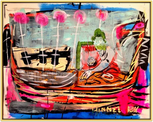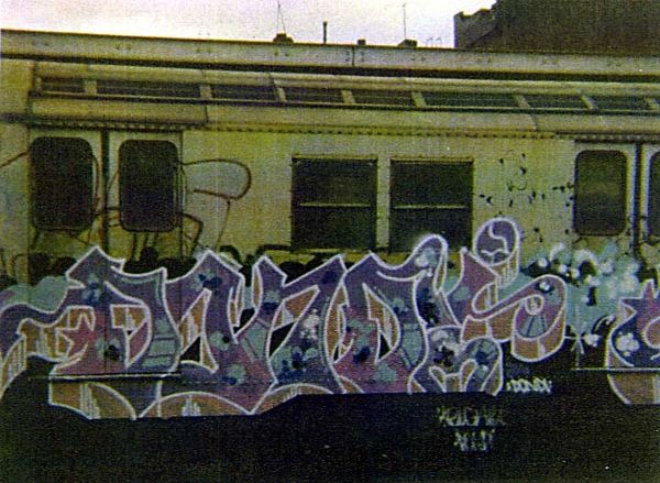 Editor: Tracy 168's "Cliff Tribute," created in 2001 using mixed media, has a real comic book vibe to me, from the Ben-Day dots in the background to the cartoon character looking out over what I assume is graffiti. What do you see in this piece? Curator: This image hums with symbolic energy! The graffiti itself – a vibrant eruption of form – speaks to a very specific act of claiming space. But look closer: consider how the subway car, the stage for this rebellious expression, is also a shared space, a space of transit and potential connection. Does the character act as a surrogate for the artist perhaps, marking their territory and identity? Editor: That makes a lot of sense. I hadn't really considered the subway car itself as symbolic. Curator: Indeed. Subway graffiti, particularly from the late 20th century onwards, became this visual battleground, a silent language understood by those within its culture. What stories do you think those colourful shapes might be telling? What shared experiences or social critiques might they be alluding to? And how does that figure, ripped straight from pop culture, amplify or distort those meanings? Editor: I suppose the character gives it a less serious tone. Like it’s playful vandalism or something… Curator: Exactly. It introduces an element of accessibility, perhaps, a familiar face amidst the chaos. A cultural bridge inviting outsiders into this very insular, vibrant world. How powerful is the act of repurposing existing imagery, like those familiar characters or cartoonish halftone shading, to then construct new narratives? Editor: That’s a perspective I hadn't really thought of before, about it acting as a bridge. So, on the surface it may seem like simple vandalism, but it speaks volumes about urban identity and community? Curator: Precisely! It is about layering meaning upon meaning. Now when you view this piece, will your reading of those images evolve to reveal cultural connections or symbolic meanings for you? Editor: Absolutely, I'll never see graffiti the same way. Thanks!