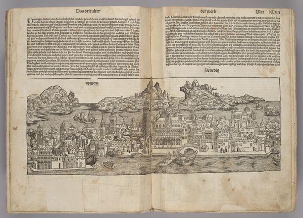 Curator: Here we have a fascinating woodcut, titled "Sena (Chapter 'The Fifth Age of the World')" by Michel Wolgemuth. Editor: My eye is immediately drawn to the tightly packed cityscape—the buildings are layered on top of each other, creating a sense of depth and density. Curator: Wolgemuth was a prominent artist in 15th-century Nuremberg, and his workshop produced many woodcuts for illustrated books. This piece comes from the "Nuremberg Chronicle". The process would have involved carving the design into a woodblock, inking it, and then pressing it onto paper, likely produced by manual labor. Editor: Absolutely. Looking at the composition, the walled city appears both fortified and vulnerable. I find myself thinking about the social structures and potential conflicts embedded within this type of community during the period. Curator: And think about the consumption of these images. They were integral to spreading knowledge and shaping perceptions of different places. Editor: I see this piece as a reminder that art isn't just about aesthetics; it's a material product deeply entwined with labor, social context, and the dissemination of ideas. Curator: A powerful testament to the ways in which images shape our understanding of the world.