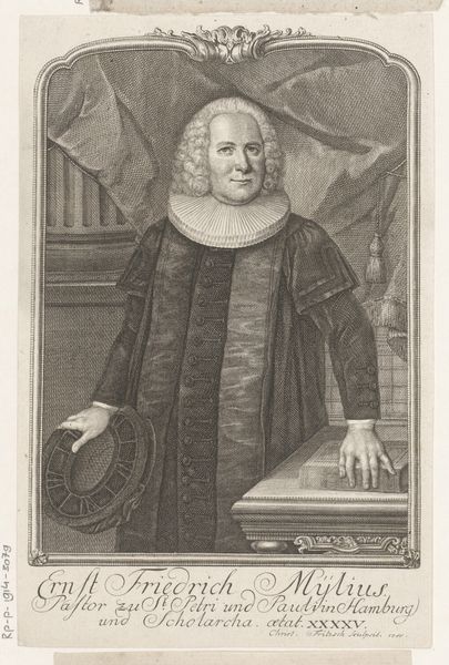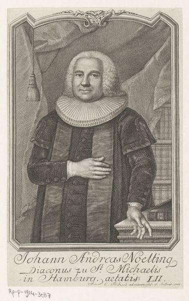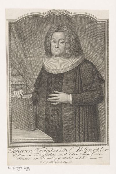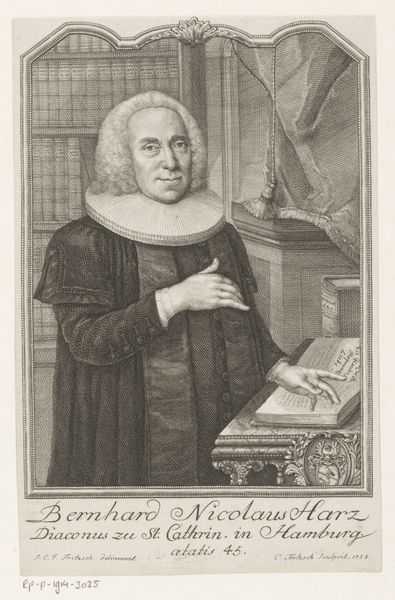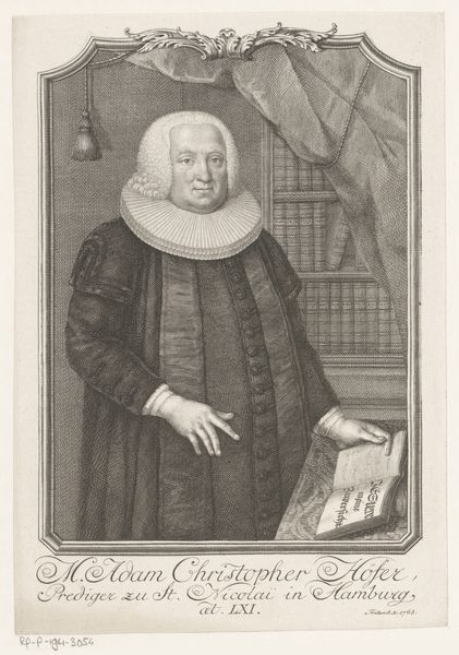 Curator: Standing before us is a striking portrait. This is "Portret van Heinrich Hoeck op 61-jarige leeftijd," created in 1761 by Christian Fritzsch. It's an engraving, offering us a glimpse into the past, preserved on paper. Editor: Well, my first impression? He looks rather…determined, doesn't he? Almost stern. The crisp lines create a very precise, formal feel, as if everything had to be just so. There's something imposing about his gaze too. Curator: Absolutely. Look at the texture achieved through engraving—the density of lines forming shadows, giving volume to his form. Fritzsch’s mastery transforms simple lines into realistic detail; for example, you can feel the fabric of his clothes, even at this remove. The formal, Baroque style certainly adds to the gravity. Editor: Yes, and the composition draws your eye directly to his face and then down to the open book and his pointing finger. The positioning, plus that large, almost theatrical collar—he really wants you to focus on what he represents: authority and intellect. The bookshelves in the background, while not hyper-detailed, add to the sense of knowledge and scholarly pursuits, right? Curator: Precisely. He was, after all, a doctor of theology and a pastor. The books become almost an extension of him—defining him. And that theatrical collar you mention, the ruff, typical of the Baroque period, frames his face and accentuates his expression. The whole image conveys stability, wisdom, experience etched onto his face through those fine lines, a man deeply engaged with religious and intellectual life. Editor: I like how the portrait also hints at status. Notice how it is composed so the book rests on an ornate table that suggests not only scholarly dedication but material comfort, as well. And he is holding a hat which shows a sign of readiness. He does not rest; his pursuit of religion never ends. Curator: You can almost imagine him about to engage in deep discussion. Perhaps even offer some witty—albeit firm—remarks. Well, this has been enlightening; the experience underscores the timeless nature of portraiture in capturing human character. Editor: Indeed. It’s always a fresh delight to explore such careful crafting across time, feeling closer to this fellow from the past!