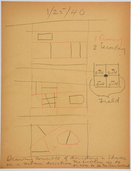 Curator: Stuart Davis' "Color Sequence Diagrams" presents, at first glance, as a set of geometric puzzles scribbled on a tan field. There's an immediate intimacy in the casual linework. Editor: I see something akin to architectural plans, or maybe even color-coded maps charting territories. There's a definite modernist sensibility at play, dismantling traditional representation. Curator: Indeed. Davis was deeply engaged with the avant-garde. The notations suggest an exploration of color theory within social structures. It hints at dismantling the established canon and colonial mappings. Editor: I think it's an intersection between the emotional and the analytical. The handwritten notes juxtaposed with these diagrams make it seem like we're witnessing the artist's stream of consciousness. A deconstruction of the world perhaps? Curator: Precisely, questioning the structures, both visible and invisible, that shape our perceptions. It's more than just color; it's a statement about power, knowledge, and representation. Editor: It certainly adds layers of complexity to what could easily be dismissed as simple diagrams, doesn't it? A fascinating glimpse into the artist's process of navigating complex ideas.