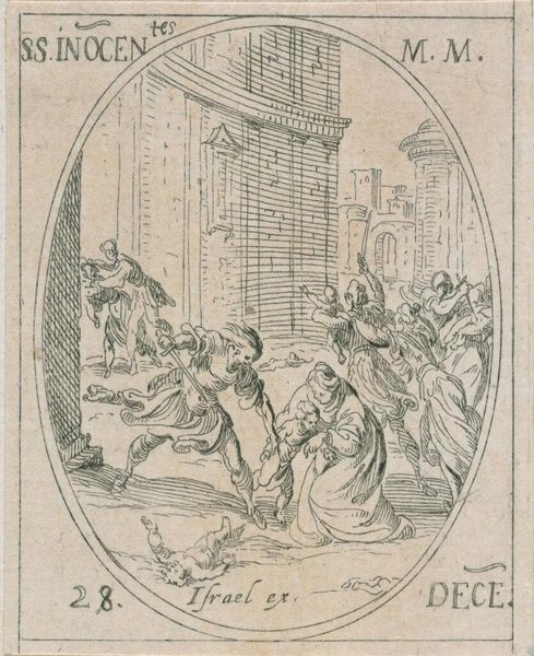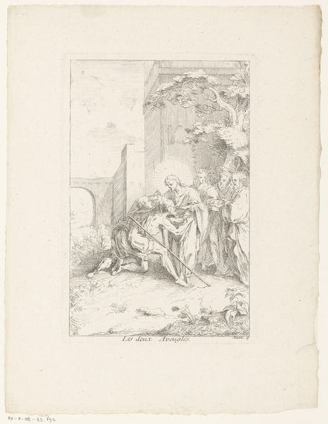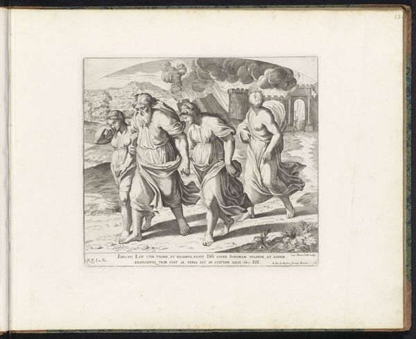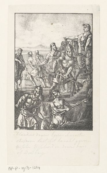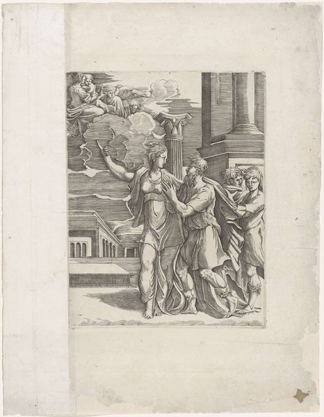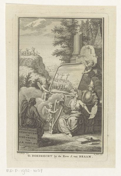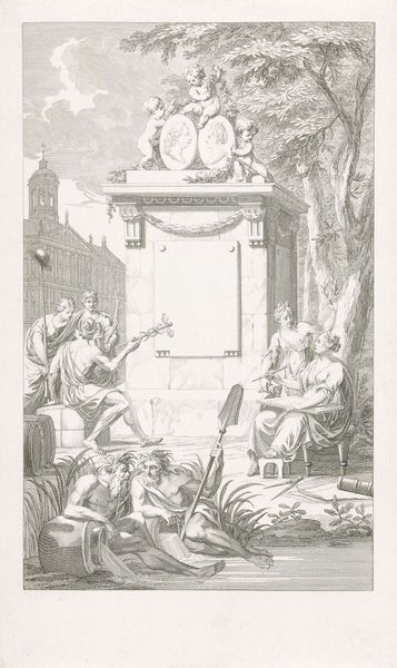 Jan Oortman created this illustration for Arend Fokke Simonsz's book on engraving in 1796, using etching to create a world of intricate lines and detailed textures. The composition is structured around a classical scene, immediately grounding us in a world of established forms and meanings. The architectural backdrop, with its strong vertical columns, frames a scene of spinning and offering. Note how the lines create a sense of depth, drawing the eye from the foreground figures to the distant ship at sea. The figures are arranged in a deliberate manner, a semiotic system of signs, with each gesture and object contributing to the narrative. The lines create texture and volume, giving life to the folds of clothing and the surfaces of objects. Oortman uses the formal elements to create a dialogue between tradition and innovation. The classical setting and the activity of spinning and weaving evoke themes of creation, skill, and the passage of time. This illustration is not just a visual accompaniment to the text, it’s a meditation on the role of the artist as an engraver.
