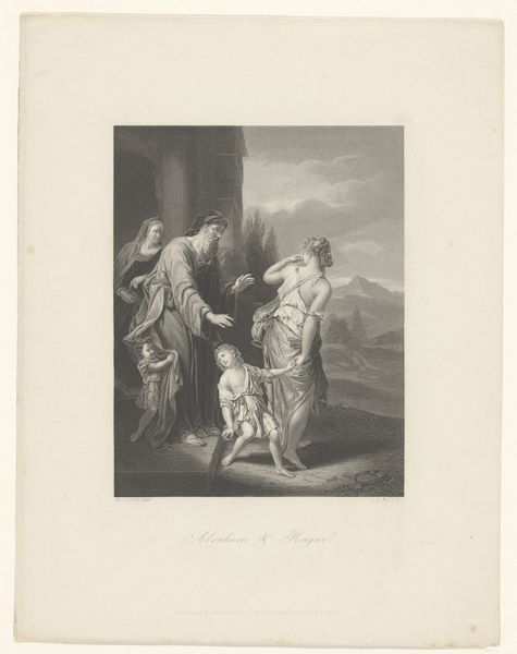 Nicolas Gabriel Dupuis created this print, "Aeneas redt zijn vader Anchises uit het brandende Troje" or Aeneas rescuing his father Anchises from the burning Troy. The artwork is dominated by a strong vertical axis, formed by Aeneas carrying his father. This line cuts through the chaotic scene of burning Troy, providing a sense of order amidst the disaster. Dupuis's strategic use of light and shadow emphasizes the muscles in Aeneas' legs, highlighting the physical strength required for this rescue. The figures are arranged in a pyramidal composition, with the base formed by Aeneas and the apex at the top of Anchises' head. This classical structure provides stability to the scene, even as flames rise in the background. Dupuis uses texture to convey the drama of the burning city, with dense, chaotic lines contrasting with the smooth, idealized forms of the figures. The print functions not just as an aesthetic portrayal of a classical story but also engages with themes of duty, sacrifice, and the burden of history, inviting ongoing interpretation.