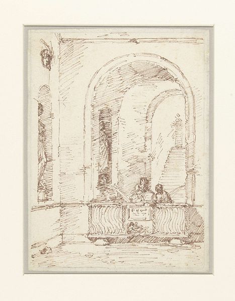 Curator: This etching by Johannes Bosboom, titled "Kerkinterieur met drie figuren," invites us into a hushed interior space before 1891. The interplay of line and form suggests a moment of quiet contemplation. Editor: The overwhelming impression, even at this scale, is somber. Those high gothic arches and shadowed figures dwarf any sense of human presence. Is it meant to feel isolating? Curator: Notice how Bosboom masterfully uses the etching technique to convey depth and luminosity. The skeletal lines and subtle gradations create a convincing three-dimensional space within the church interior. Editor: And it isn’t merely depth but social stratification etched into those very lines. The grand architecture signifies power structures that inherently dictate one’s positionality. Curator: That is a fascinating point, however, my interest is how the starkness enhances its architectural features. The lines lead our eye to traverse this expansive, empty space. The realism feels uniquely intimate. Editor: I understand your reading, but that interpretation misses crucial implications; what appear to be stylistic features serve to communicate messages concerning the period in which the work was made. The intersection of sacred space and implied social order subtly condones historical inequities. Curator: But shouldn’t we, for a moment, divorce it from sociopolitical interpretations? Bosboom offers a serene sanctuary away from exterior concerns. Is not that artistic intention also valuable? Editor: Can art truly exist in a vacuum? Regardless of an artist's intent, an artwork becomes a product and signifier of an ideological, sometimes unjust, world. Analyzing through only stylistic formalism allows the perpetuation of damaging norms. Curator: It appears we find ourselves at an interpretative impasse! The beauty in this church scene, perhaps, lies between both aesthetic observation and contextual reckoning. Editor: Perhaps by weaving together perspectives, even oppositional ones, a richer viewing experience will be forged.