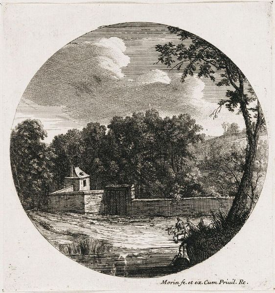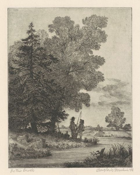 Curator: Before us is Karl Ludwig Zehender's "Landscape," a drawing held in the Harvard Art Museums. Editor: It's quite atmospheric; the muted tones give it a somber, almost wistful quality. The textural rendering of the foliage and subtle use of line are interesting. Curator: The small scale speaks to the function of landscape drawings in the 18th century. They became important in academic training as well as personal artistic practice. Editor: And notice the figure, presumably fishing, nestled into the landscape. His posture seems less about leisure and more about existing under the weight of his labor within this space. Curator: Landscapes during this period were increasingly used to depict not only idyllic settings but also the impact of human activity, reflecting societal changes. Editor: The drawing prompts a meditation on humanity's place within nature and how our tools, like fishing rods or even windmills, tie us to the land. I see this drawing and understand a connection to labor in my own time. Curator: Indeed, Zehender provides us with more than just a landscape; he gives us a glimpse into the cultural landscape of his time. Editor: And I am left pondering the quiet dignity of working people through a focus on materials and that man’s connection to the water.