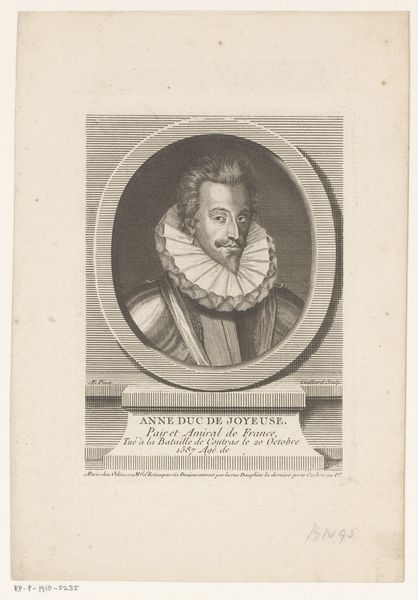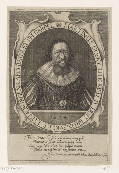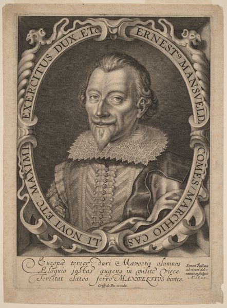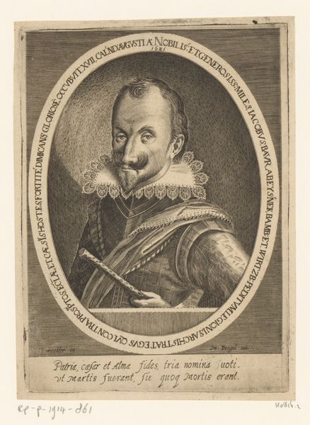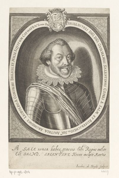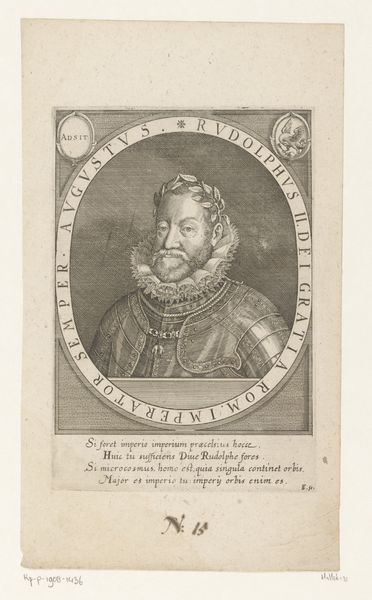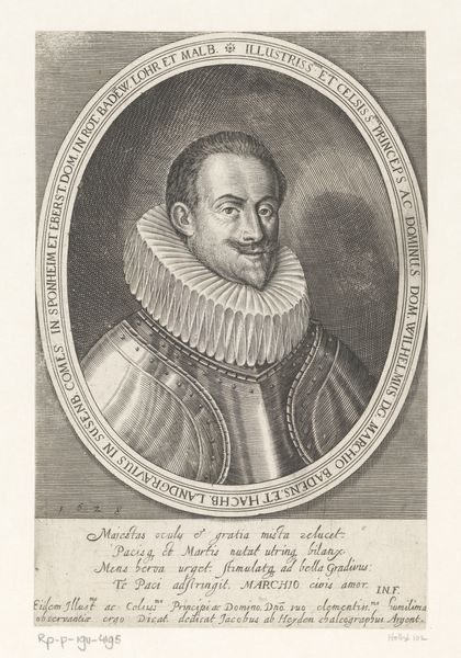 Curator: This engraving by Lucas Kilian, "Portret van Christian von Anhalt-Bernburg" from 1615, is striking. I think it provides rich insight into early 17th-century society, don’t you agree? Editor: It really does. This print, with its formal inscription and armored figure, feels so stiff and official. It's interesting how such a mass-produced medium tries to project such power. What's your read on this? Curator: I'm immediately drawn to the materiality of the printmaking process itself. Consider the labor involved in producing the copper plate, the skills required to etch the image with such detail, and then the subsequent reproduction and distribution of these prints. Each step reveals a hierarchy, a system of production and consumption. Think about who would have been able to afford such a print, who controlled the means of its creation, and what that says about early 17th-century society? Editor: So, the value isn't just in the image of Christian, but in understanding who had access to creating and possessing such imagery? Curator: Precisely! The image of Christian serves almost as an advertisement, not only for him, but for the skilled labor and resources of his court. The engraving itself becomes a commodity, reflecting and reinforcing the existing power structures. Do you notice how the lines create a sense of texture and depth, attempting to mimic the richness of a painted portrait? Editor: I see that. It is trying to present something high end, while being more easily manufactured than painting. It almost cheapens it a bit, and makes it…advertising, like you mentioned. Curator: Yes! And look at the text surrounding Christian. Latin, indicating an educated elite audience, but also functioning as branding, associating him with nobility and even a divine right to rule. The production, dissemination, and consumption of this print reinforced this power. Editor: That really shifts my perspective. I was focused on the stern face, but it's more about who commissioned the work, who made it, and who consumed it. It shows who the powerful people were. Curator: Exactly. Thinking about these works in terms of labor, production, and material allows us to better understand not just the subject, but the social fabric of the time. I am glad you also learned to think about portraiture in the context of materials.