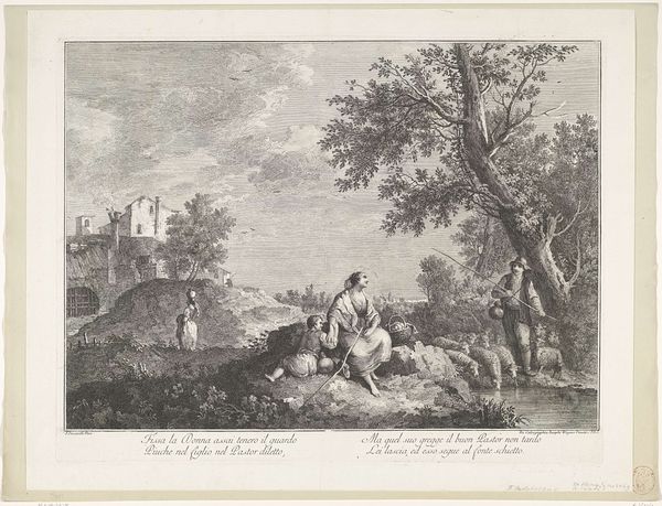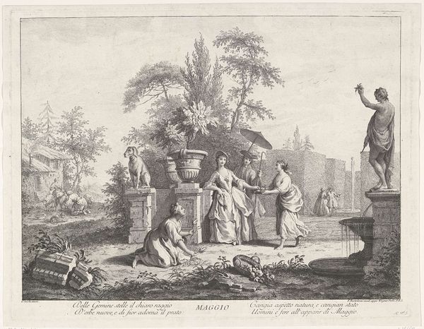 Curator: What strikes me immediately about this print, titled "Tuinconcert," or "Garden Concert," by Bernard Picart, is its incredibly elaborate, almost theatrical, presentation. Editor: The theatricality is certainly prominent. It reads as highly stylized. I am most struck by the composition—how it balances the detailed foreground figures with a landscape receding into the background. There’s a strong sense of depth. Curator: Indeed, the work dates back to 1709 and utilizes engraving. As you’ve mentioned, we see figures arranged in what almost feels like a stage setting, with musicians and listeners interspersed in a garden environment. These garden concerts were fashionable entertainments of the Baroque period, laden with symbol and meaning for those in the know. Editor: How so? What symbolic threads are you seeing? Curator: The garden itself, cultivated and manicured, represented the control of man over nature, an ideal in that era. Music, particularly harmonious music, was understood to create social order, so it makes sense that this imagery would take hold among the elite. Look how attentively people listen and watch as others make music. Editor: Yes, the interplay between music, nature, and societal order. And look how meticulously Picart details textures—the folds in the clothing, the leaves in the trees, it all suggests social ritual, and order within an artificial nature, and culture reflected in music. Curator: There's even text running along the lower part of the artwork that encapsulates some of the mood—a description in French that includes words suggesting that "everything is a good concert." The suggestion is a world attuned to perfect concord. Editor: So it really serves as a window into a specific moment in history. One almost idealized. Curator: Precisely! These visual motifs allowed people to reflect on their roles within that social structure, but also their aspirations. And to aspire towards order and pleasure during a complex moment in time is indeed revealing. Editor: The layering of detail in Picart's technique provides a captivating entry point into that world. Thank you for bringing it to life, seeing the social meanings in its structure and subject.