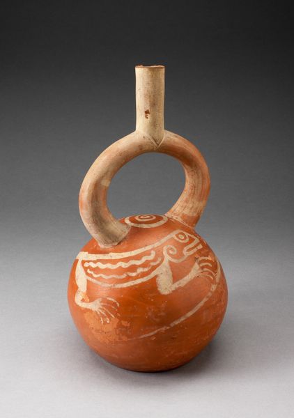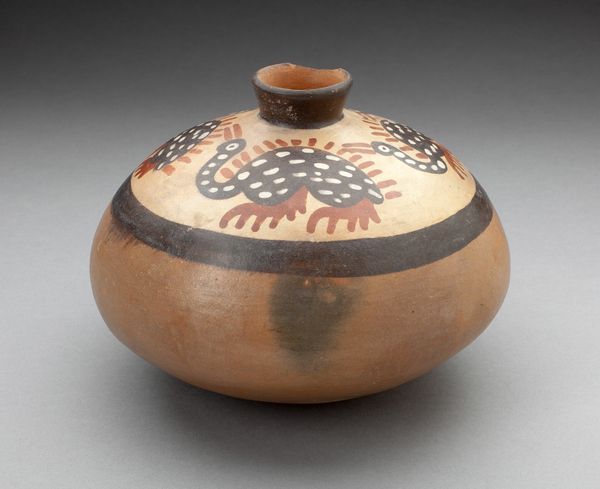 Editor: So this is a Nazca spouted jar with a repeated abstract motif, dating roughly from 180 to 500 CE. It’s ceramic and currently resides at the Art Institute of Chicago. I'm struck by the bold geometric design against the cream backdrop. It almost has a modern feel, despite being so ancient! What leaps out at you when you see it? Curator: It’s remarkable, isn't it? You're right; there's a timelessness to that abstraction. It makes me wonder about the artist, you know? What were they thinking as they repeated that motif, which some scholars think represent stylized faces? Were they in a meditative state, telling a story, or just following convention? The form is so tactile. Can't you just imagine the feeling of the clay? Editor: I can, and I wonder about the practical side of it. The spout looks functional, like it was actually used to pour something. Does that influence how you see the decoration – as secondary to its purpose, maybe? Curator: That's a terrific point. Often, we’re tempted to separate “art” from “craft,” but these ancient cultures didn't necessarily make that distinction. The function informs the design, becomes integral to its beauty. Imagine using this vessel every day—the ritual involved in that. Suddenly those abstract figures might hold very deep significance! It invites such daydreaming...don’t you think? Editor: Definitely. I initially saw it as purely decorative, but thinking about its use gives it so much more depth. Curator: Exactly! And that little leap, that shift in perspective, is where the magic happens. The object becomes a window into another world. Editor: It's amazing to think something so old can still provoke new thoughts and feelings.