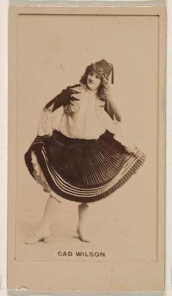 Curator: The image before us is a vintage portrait of Miss Vincent. It was included in a series of actress trading cards, (N245), distributed around 1890 by Kinney Brothers to promote their Sweet Caporal Cigarettes. These cards are a mix of drawing, photography and print. Editor: My immediate reaction is a kind of constructed artifice, a theatricality in its presentation. Look at the flattened perspective and shallow depth of field, forcing all attention onto the central figure. Curator: The card's function as advertising meant it also worked to elevate actresses to celebrity status. Note her dress; it seems styled with some historical drama in mind. Perhaps suggesting a role she embodied. Editor: That garment offers significant visual interest, actually. The strategic placement of dark bands and the cross at the chest serve almost like structural beams within the composition. They organize how our eye travels. Curator: Such garments helped craft an image that reflected both morality and fashionable trends, allowing actresses to become aspirational figures, bridging art and everyday life. She almost appears to be bestowing the gift of flowers on the viewer. Flowers symbolize youth, beauty and the fleeting nature of life. This pose invites admiration, projecting purity and a touch of melancholy, which was highly appreciated back then. Editor: Observe also how the limited tonal range further isolates Miss Vincent against a relatively ambiguous background. Her hair and complexion—a sort of muted ochre—create visual unity that reinforces this singular focus. I want to say, the picture's power emerges precisely from this very self-conscious staging. Curator: Absolutely. And the format contributed: mass-produced trading cards placed accessible glamour right into the consumer's hands, literally pocket-sized stardom that extended into the realm of collectibles. Editor: So what seems simplistic, at first glance, proves a site of intense visual and cultural coding when we analyze its elements closely. Curator: Precisely, a small window onto a moment in time. Editor: Agreed. A small yet revealing frame.