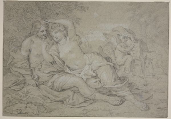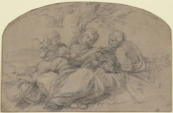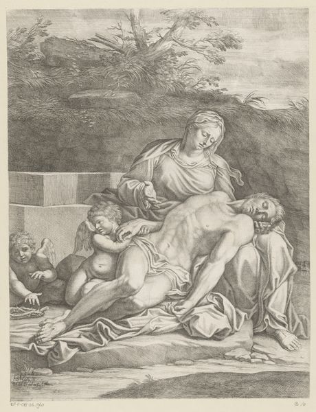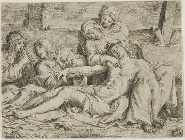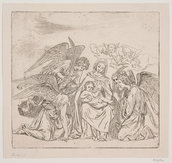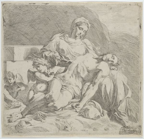 Curator: Let's turn our attention to "Anche a me, Madre mia!", or "Me too, mother!", a print made by William Young Ottley in 1828, currently residing here at The Met. Editor: Immediately, I'm struck by the density of emotion communicated through a relatively simple black-and-white print. The intertwined figures, their faces heavy with either exhaustion or sorrow—it's intensely intimate and sorrowful. Curator: It's a striking piece for sure. Ottley, while working with a medium of reproducible prints, draws upon the aesthetic ideals of Romanticism, as well as engaging with conventions of history painting through figuration and narrative. In the 19th century, these works were increasingly circulated as illustrations, displayed in salons and galleries, influencing tastes and artistic ideas. Editor: What I find compelling is how this piece, ostensibly depicting a personal or domestic scene, could be so easily imbricated into the grand narratives of history painting. Whose history, whose narrative gets monumentalized? There's such vulnerability within this image— a woman’s hand outstretched, perhaps pleading, with a clear need to care for those behind her. And here she is at the heart of this… something that looks quite deliberately composed for display. What is the meaning that we're ascribing through display and viewership? Curator: Exactly. The print functions on multiple levels, both mirroring and participating in cultural constructions of domestic life and heroic subject matter, like those seen throughout Western art. It gives an opportunity to explore how Romanticism as a movement, despite the claims toward universality, became shaped by bourgeois values of the domestic. Editor: Thinking of Ottley's other work, this piece takes on new layers, because much of his other work served the project of collection. As an investment, this also makes sense, considering this tension and overlap with so-called "high" and "low" art. Ottley straddled that boundary by not committing to being an artist himself, but taking an interest as someone with access. The questions about accessibility also become relevant when looking at Ottley, and this reproduction is yet another intervention by which to participate in the visual narrative-making. Curator: In viewing this print, we are left not only to reflect on its immediate subject matter, but to consider the world that it existed within. Editor: Right, it demands we contemplate the layers of mediation inherent in visual representation, both then and now. It is quite evocative to reconsider today the historical and socioeconomic processes embedded within these kinds of representations, particularly as the images get repeated and remixed throughout art history.