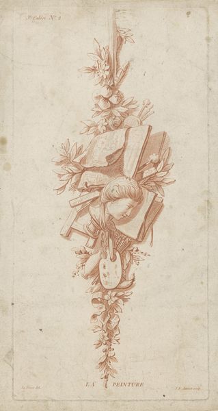 Curator: Here at the Rijksmuseum, we have before us "Trofee met helmen en harnas," or Trophy with Helmets and Armor. This engraving, created by Gottlieb Friedrich Riedel in 1779, is a stunning example of Baroque printmaking. What’s your first take, Editor? Editor: Well, I'm immediately struck by its slightly menacing elegance. It's as if all the grim possibilities of conflict have been tidied up into a neat, almost decorative package. Sort of says "war, but make it fashion", doesn't it? Curator: Indeed. Observe how Riedel uses line and composition to create a sense of order and structure. The symmetry, while not perfect, offers a clear visual hierarchy. The various elements of warfare, carefully arranged, create a potent symbolic statement about power. Editor: I dig the composition—it feels top-heavy, like the whole thing's gonna topple over any second! Maybe Riedel was hinting at the fragility of power, or the constant tension of maintaining it back in the day. It's as if he froze a moment of precarious balance. Curator: One could interpret it that way. But the engraver's skill in rendering texture cannot be denied; from the sheen of the helmets to the roughness of the various fabrics, a certain illusionistic reality is established. Note also how Riedel positions the frame as an integral compositional element. Editor: Oh, for sure, it's beautiful craftmanship. But this trophy still has that playful, slightly absurd energy of, like, putting on your armor to go fetch a croissant from the bakery! The artistry itself nearly undercuts the violence that made such displays of strength possible. Curator: The engraving, produced during the latter stages of the Baroque period, demonstrates a transition into a more refined, ornamental sensibility, while retaining Baroque grandeur. Its function transcends simple militarism and engages the sublime as a way to project state authority and aesthetic pleasure. Editor: Hmm... maybe so. Still, the work reminds me that war isn’t just a clash of weapons or nations—but also about showing off, strutting, and posing with your spoils in the flashiest way possible. Perhaps that’s just how power presents itself, then and now. Curator: Precisely. “Trofee met helmen en harnas” compels us to think about the relationship between martial prowess, artistic creation, and political representation. Editor: Yep, a grimly fashionable piece of historical reflection that has you think! I’m all for it.
