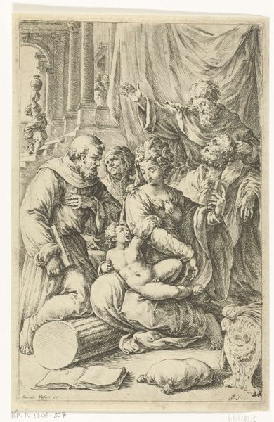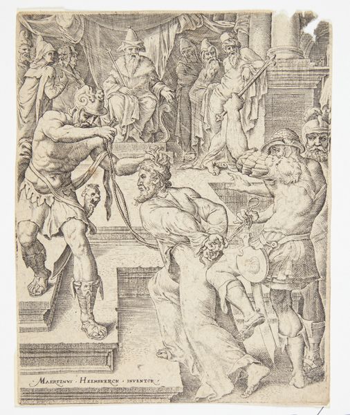 Dirck Volckertsz Coornhert created this print, "Joseph Interprets Pharaoh's Dreams," around 1550 using engraving. The composition, rendered in stark contrasts of light and shadow, evokes a scene of dramatic tension. Note how the lines create a sense of depth, guiding your eye from the foreground figures to the distant architecture. The formal structure of the engraving, with its careful arrangement of figures and symbols, suggests a deeper narrative. Consider the way Coornhert uses linear perspective to frame Joseph as the focal point. This artistic technique is not merely representational, but also underscores Joseph's role as the interpreter of divine will, subtly reinforcing the complex relationship between power, knowledge, and faith. The angularity of the lines and the contrast between light and dark imbue the scene with a sense of drama and tension. The composition is not simply a depiction of a biblical scene; it is also a meditation on the nature of interpretation and the role of the artist as a decoder of complex symbolic systems.