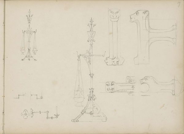 This pencil drawing, "Mannenkop en ornamenten," by Carel Adolph Lion Cachet, features a series of ornamental sketches alongside a man's profile. Dominating the composition are stylized weapon or tool handles adorned with triangular or bulbous heads. The recurrent spiral motif that terminates the handles is of particular interest. It echoes the ancient symbol of the labyrinth, representing a journey or a complex path. From the Minoan labyrinths, to medieval church floors, this symbol suggests a transformative quest. The spiral's presence here speaks to the enduring human fascination with cycles of life and death. Its persistence through millennia suggests a deep-seated psychological resonance, engaging our subconscious understanding of time and existence. Thus, the spiral in Cachet's drawing is not merely decoration, but a conduit to our collective memory, where ancient symbols continue to shape our perception and emotional experience.