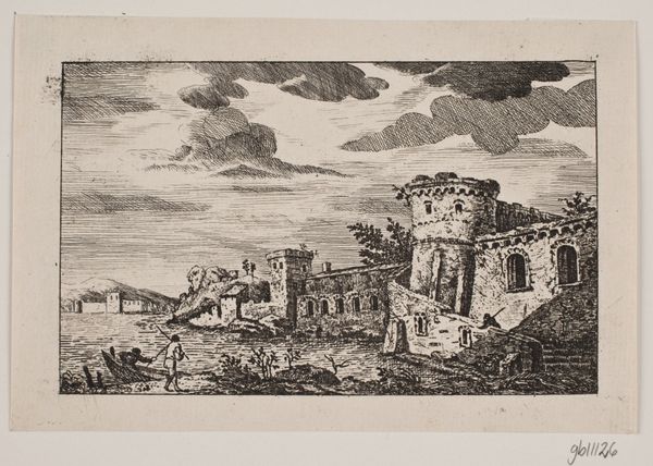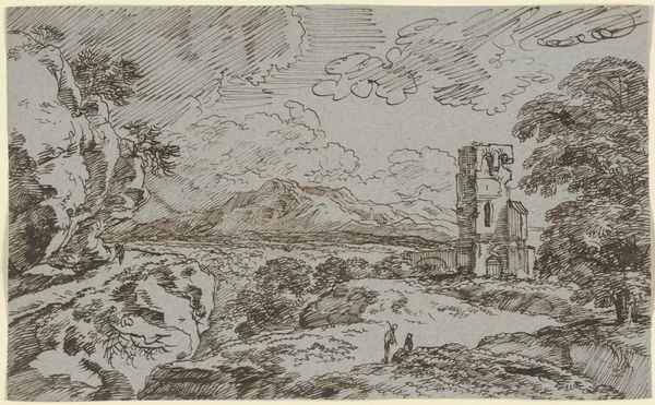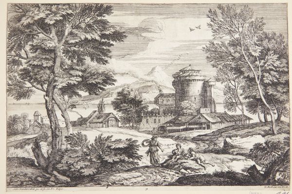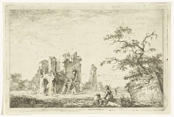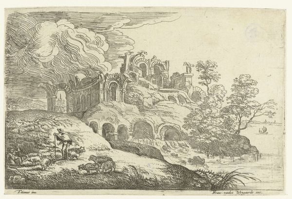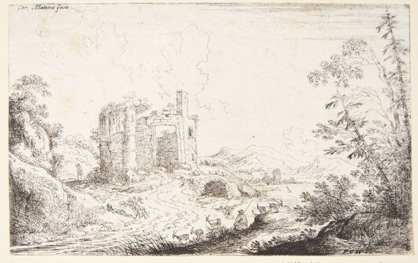 Curator: This is "Landscape with a Goat Herder," a print made with etching and ink by Cornelis Matthieu, likely between 1637 and 1656. It’s an intimate scene, only about 10cm by 16cm. What strikes you initially? Editor: Ruin and promise. Those tumbled stones seem to mourn a lost world, but the goats suggest ongoing vitality. It reminds me of a dreamscape caught between epochs. Curator: Cornelis Matthieu, situated in the baroque era, grapples here with notions of decline and persistence. Consider the historical backdrop of constant war and societal upheaval. What symbols might resonate within that tumultuous time? Editor: Beyond the ruin as a memento mori, the figure of the goat herder interests me. Herding—care and control of animals—as an ancient trope speaks to humankind's negotiation with the natural world. Even the scattered birds in the sky. Curator: Precisely! The goats, with their pagan associations, contrast sharply with the crumbling structure—perhaps once a site of authority. And there's also something compelling in how this simple rustic figure wanders within it. Is this about taking control, or finding comfort amidst fallen hierarchies? Editor: I also find it striking how the composition leads the eye: a winding path leads to a structure which is a frame in itself to nature. Curator: You’ve identified an interplay that draws us back to that goat herder as a connecting force in this terrain of natural wonder and deconstructed power structures. How might viewers connect with that today? Editor: By seeing themselves reflected in this scene—confronted with legacies of the past, tasked with carving a path into an uncertain future, accompanied only by humble truths. Curator: Beautifully put. Matthieu captures this complex intersection—inviting us to locate ourselves within the continuous narratives of loss, resilience, and the ongoing negotiation of human existence.